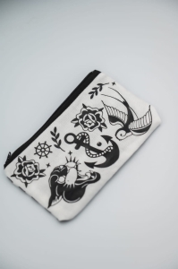 Kosmetyczka/piórnik z wyrazistym czarno-białym nadrukiem w stylu oldschool tattoo. Z jednej strony grafiki (kotwica, jaskółka, róże), z drugiej biało-czarne paski i subtelny napis. Zapinana na zamek.