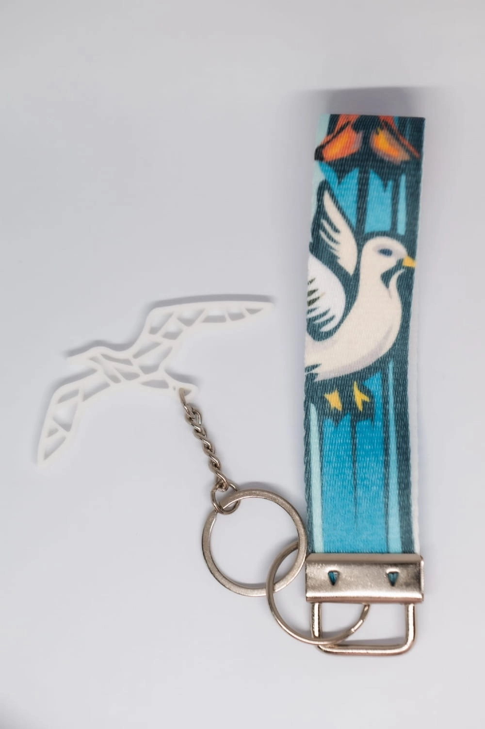 Brelok z figurką mewy 3D oraz paskiem poliestrowym z motywem mewy i latarni morskiej w stylu oldschool. Klimatyczny dodatek inspirowany morzem i przygodą.