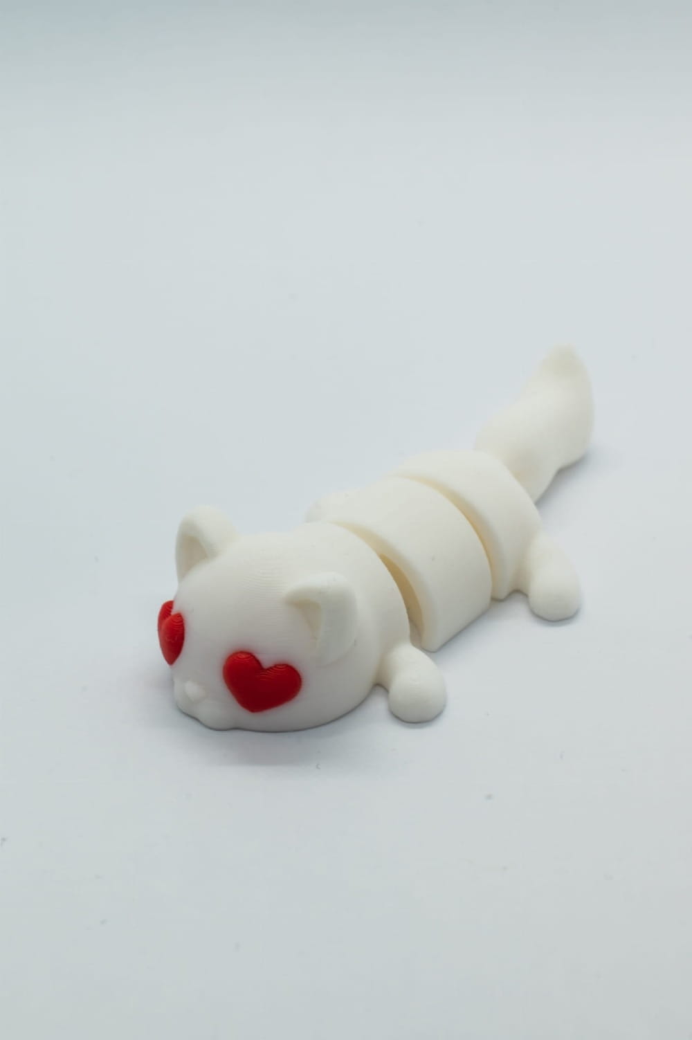 Przedstawiamy wyjątkowego Białego Kota Flexi z Czerwonymi Oczami w Kształcie Serc, wykonany techniką druku 3D z trwałego tworzywa PLA. Całe jego ciało jest elastyczne i ruchome w stylu „flexi”, co nadaje figurce zabawnego, lekko „żywego” charakteru.