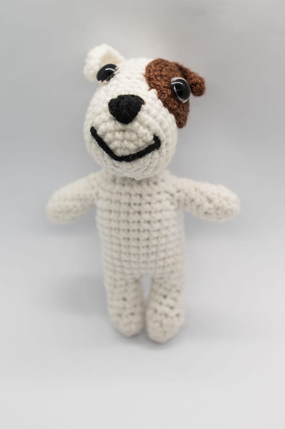Ten szydełkowany brelok przedstawiający białego psa z brązową plamką został wykonany ręcznie w Polsce z dbałością o każdy detal. Wyraziste kolory i delikatne detale nadają codziennym przedmiotom przyjaznego, rękodzielniczego charakteru.