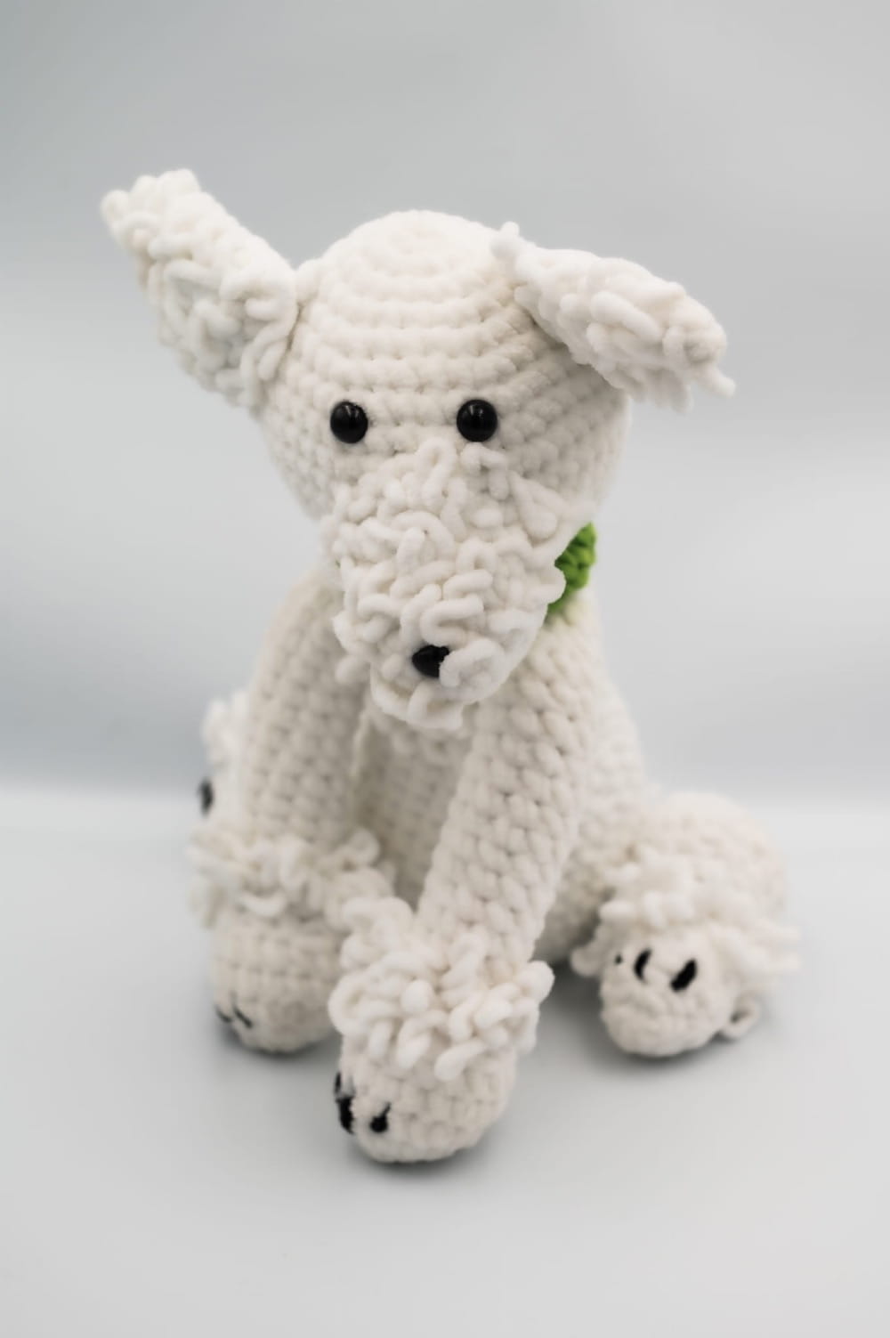 Biały pies wykonany z miękkiej włóczki, z zieloną obrożą. Urocza dekoracja, która doda przytulności i elegancji każdemu wnętrzu.