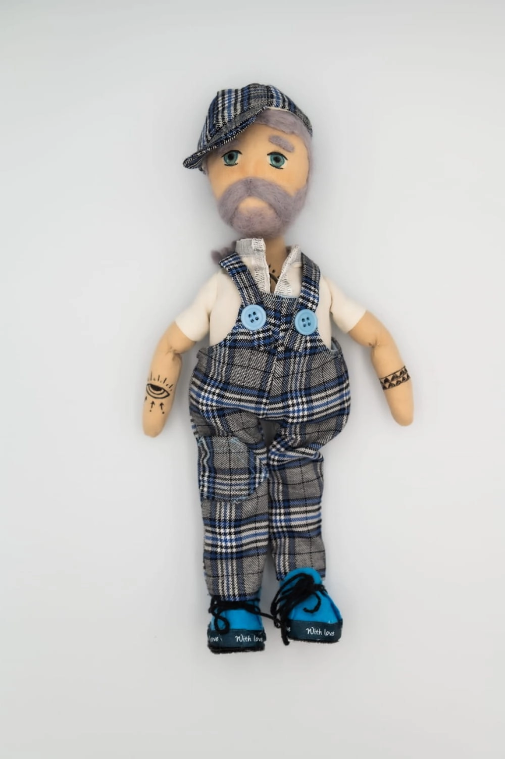 Blue Check, uszyta postać z tatuażami