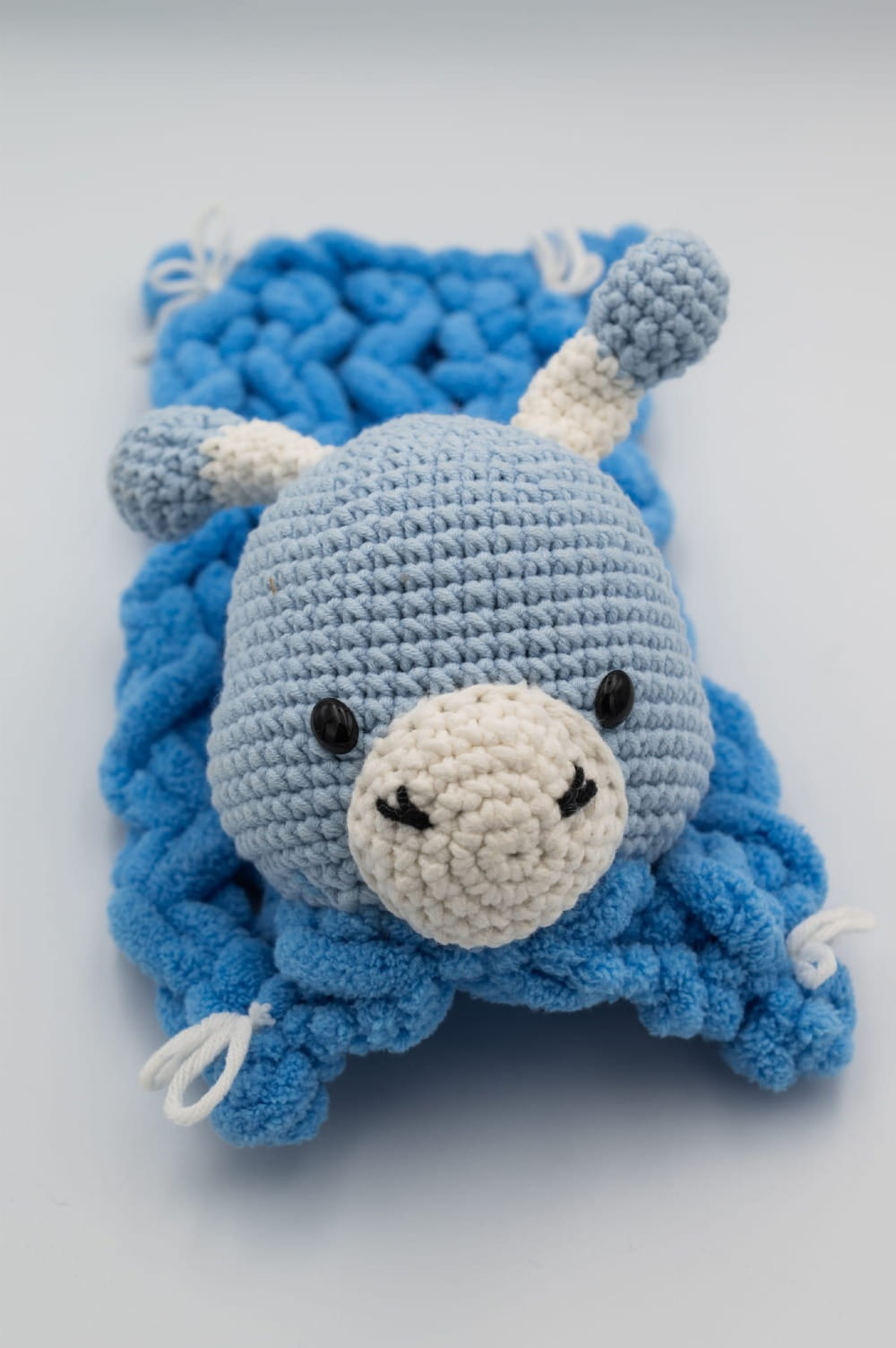 Blue Giraffe to ręcznie wykonany kocyk dekoracyjny w odcieniach niebieskiego, stworzony z miękkiej, puszystej włóczki. Jego charakterystycznym elementem jest starannie wykonana niebiesko-biała głowa żyrafy, która nadaje kocykowi wyjątkowego i zabawnego charakteru. Ten unikatowy kocyk sprawdzi się jako dekoracyjny akcent w aranżacji wnętrza, ozdoba półki, fotela lub element kolekcji rękodzieła. Ręcznie stworzony w Polsce z dbałością o detale i estetyczne wykończenie.