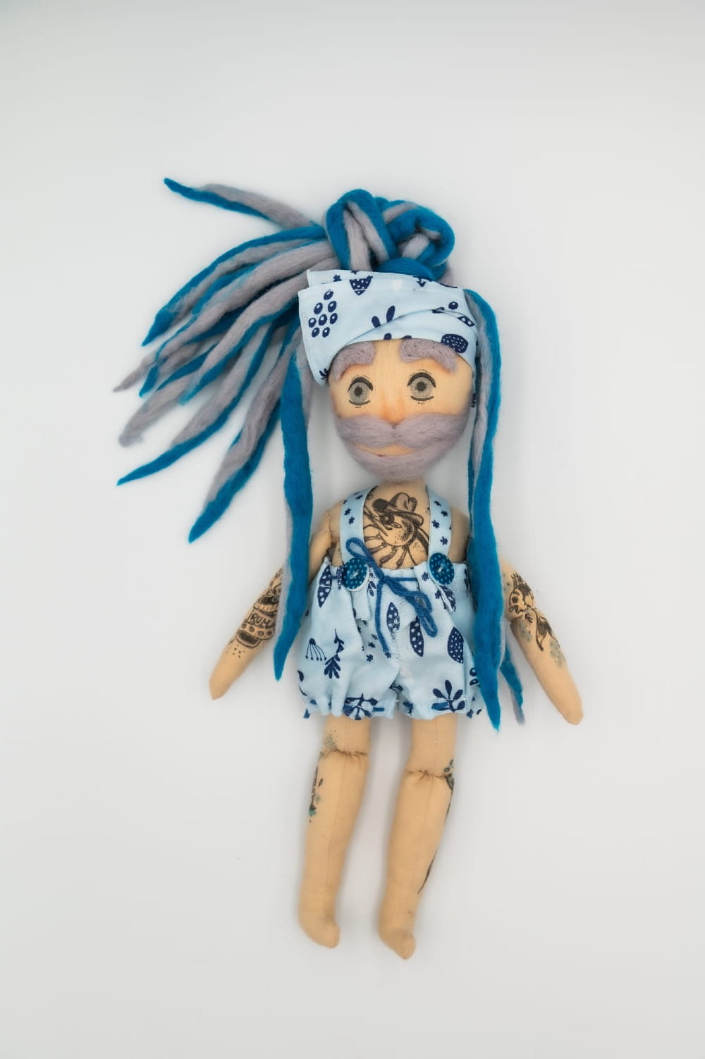 Blue Wave, uszyta postać z niebieskimi dredami i tatuażami
