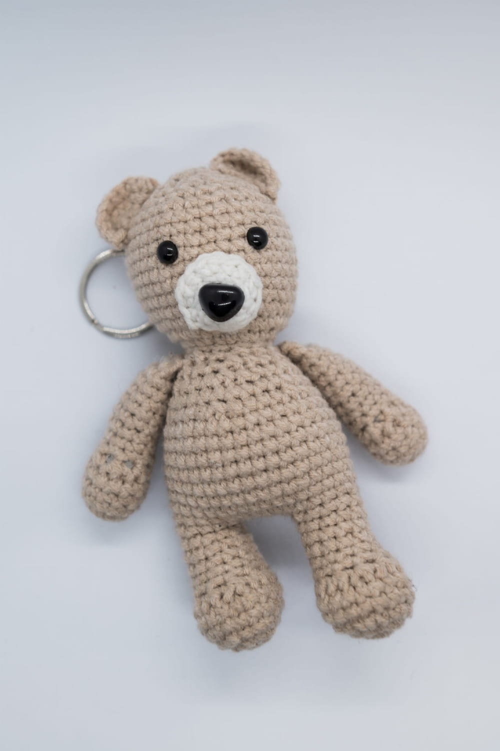 Ręcznie robiony brelok w kształcie brązowego misia, wykonany na szydełku z miękkiej włóczki. Klasyczny, uroczy i ponadczasowy dodatek do kluczy, plecaka lub torby. Idealny prezent handmade.