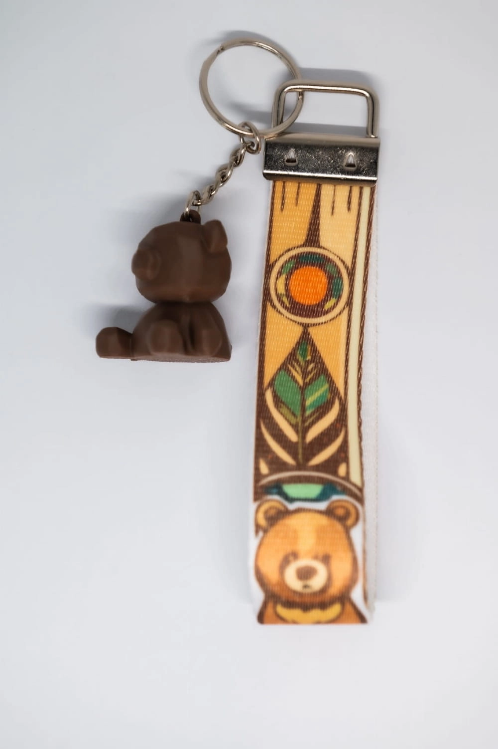 Uroczy brelok z figurką misia drukowaną w 3D i paskiem poliestrowym z motywem niedźwiedzia w stylu oldschool. Idealny dla miłośników natury i stylowych detali.