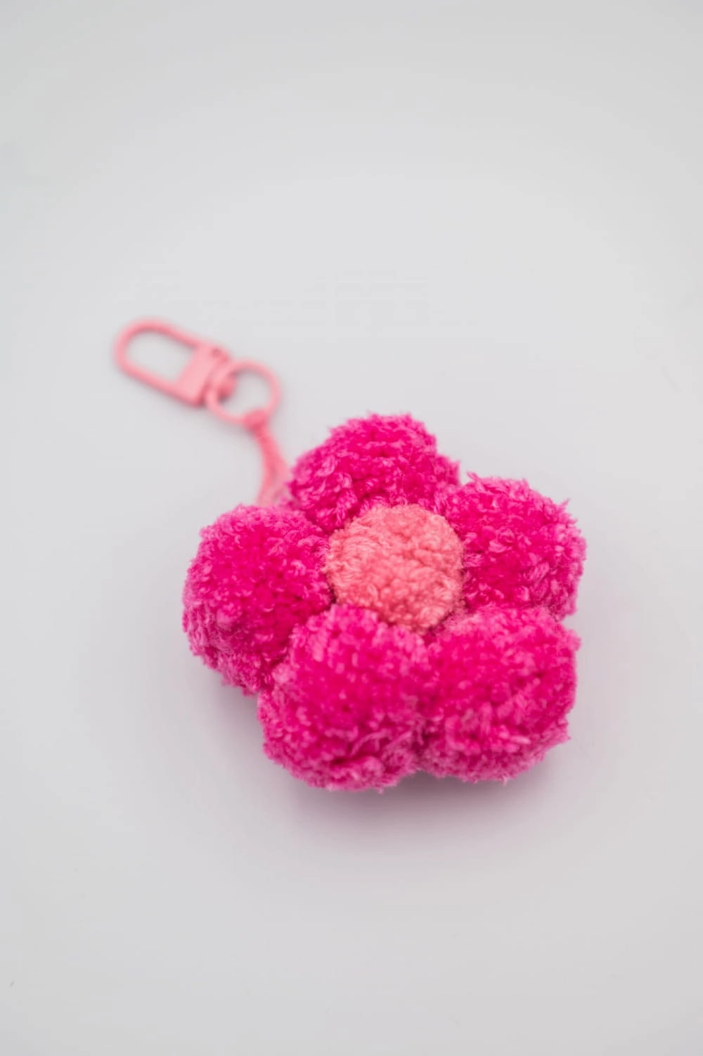 Uroczy brelok w kształcie kwiatka wykonany ręcznie z miękkiej włóczki. Idealny jako ozdoba do kluczy, torebki lub plecaka.