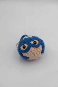 Ręcznie wykonany z włóczki brelok/zawieszka przedstawiający beżową twarz w niebieskim hełmie. Stylowy dodatek do kluczy, torby lub plecaka.
