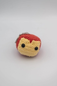 Brelok szydełkowy – głowa w hełmie czerwono-żółta