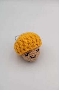 Brelok/zawieszka w formie grzyba to ręcznie wykonany na szydełku dodatek, dopracowany w każdym detalu. Beżowa „noga” z oczami i intensywnie żółta góra tworzą wesołą i charakterystyczną formę, która przyciąga wzrok i dodaje uroku codziennym przedmiotom.