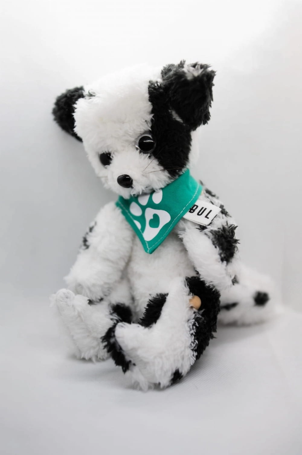Czarno-biały pupil o nieregularnym, cętkowanym wzorze i miękkiej, włochatej strukturze. Zielona chustka dodaje mu świeżości i wyrazistego charakteru.