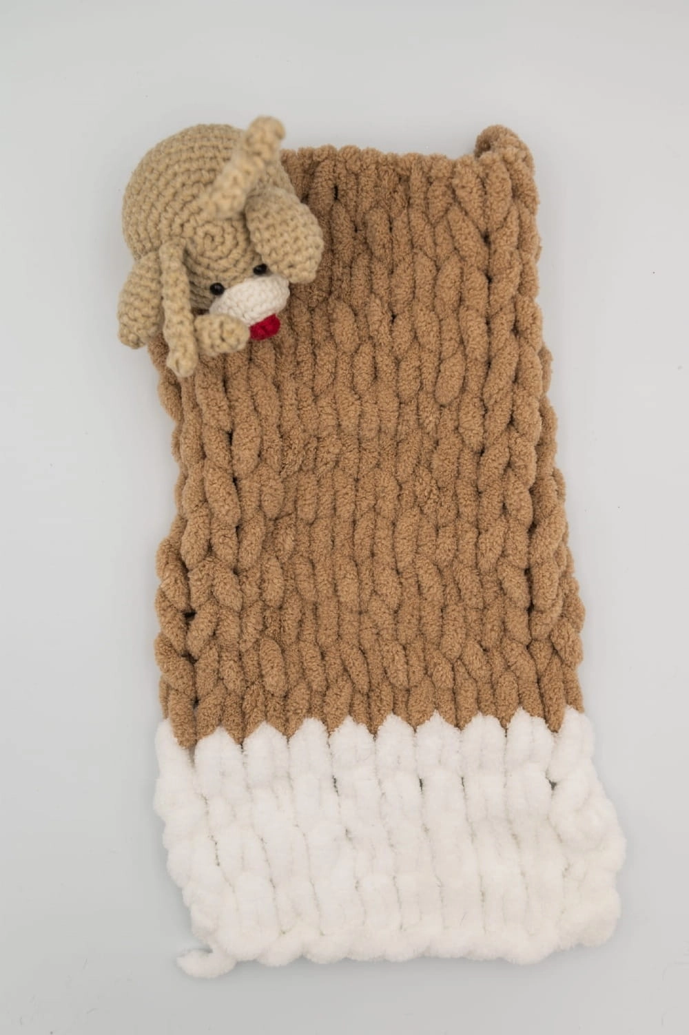 Cocoa Nose to ręcznie wykonany kocyk dekoracyjny w odcieniach brązu i bieli, stworzony z miękkiej, puszystej włóczki. Jego charakterystycznym elementem jest starannie wykonana głowa renifera z czerwonym nosem, która nadaje kocykowi zabawnego i przytulnego charakteru. Ten unikatowy kocyk sprawdzi się jako dekoracyjny akcent w aranżacji wnętrza, ozdoba półki, fotela lub element kolekcji rękodzieła. Ręcznie stworzony w Polsce z dbałością o detale i estetyczne wykończenie.