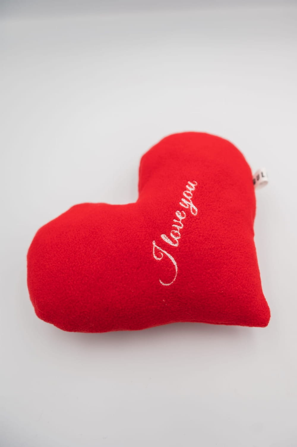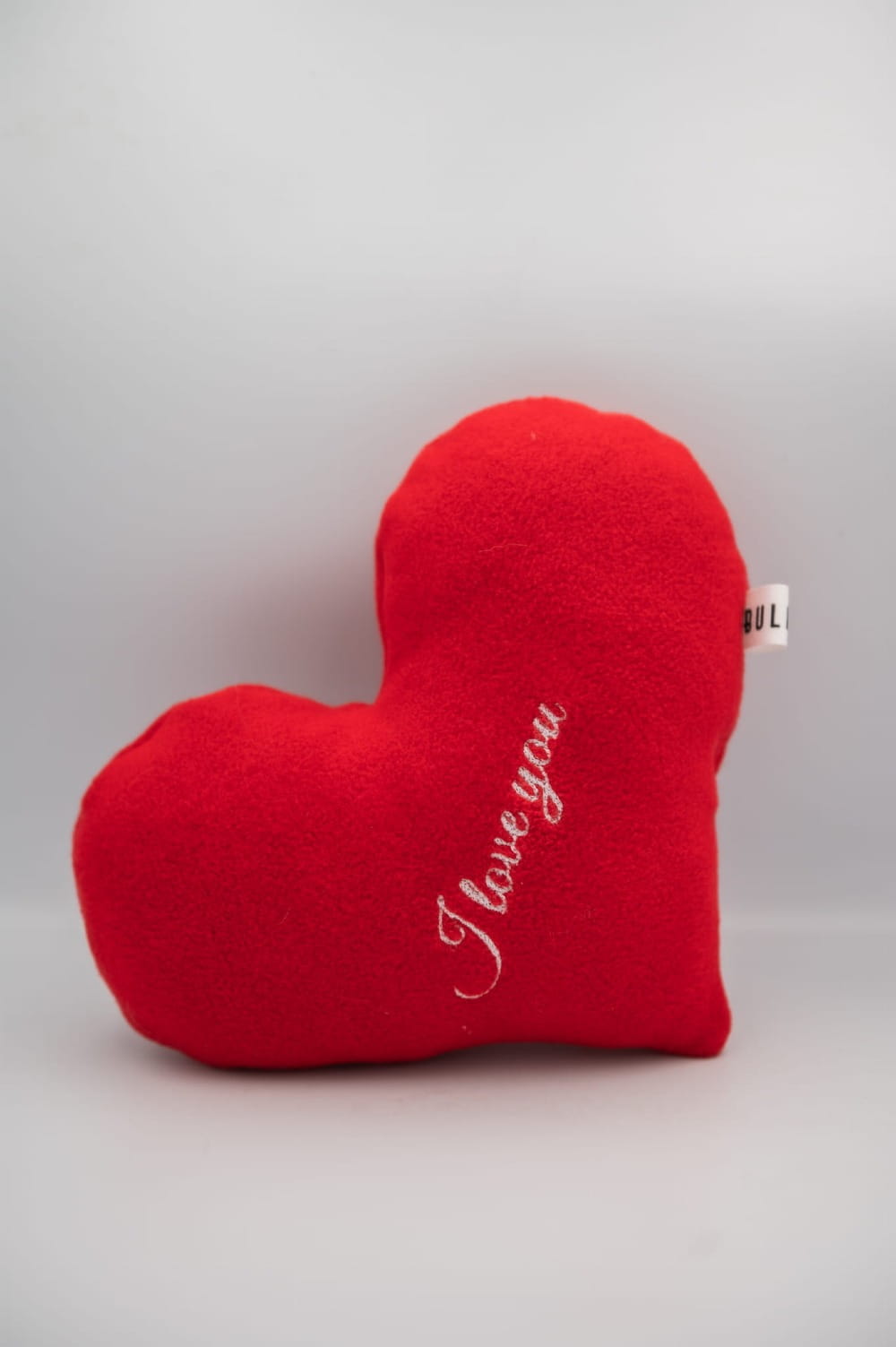 Poduszka została uszyta ręcznie z przyjemnego w dotyku, miękkiego polaru w intensywnym czerwonym kolorze. Biały haft z napisem I LOVE YOU pięknie kontrastuje z tkaniną, tworząc wyrazisty, romantyczny akcent, który natychmiast przyciąga uwagę.