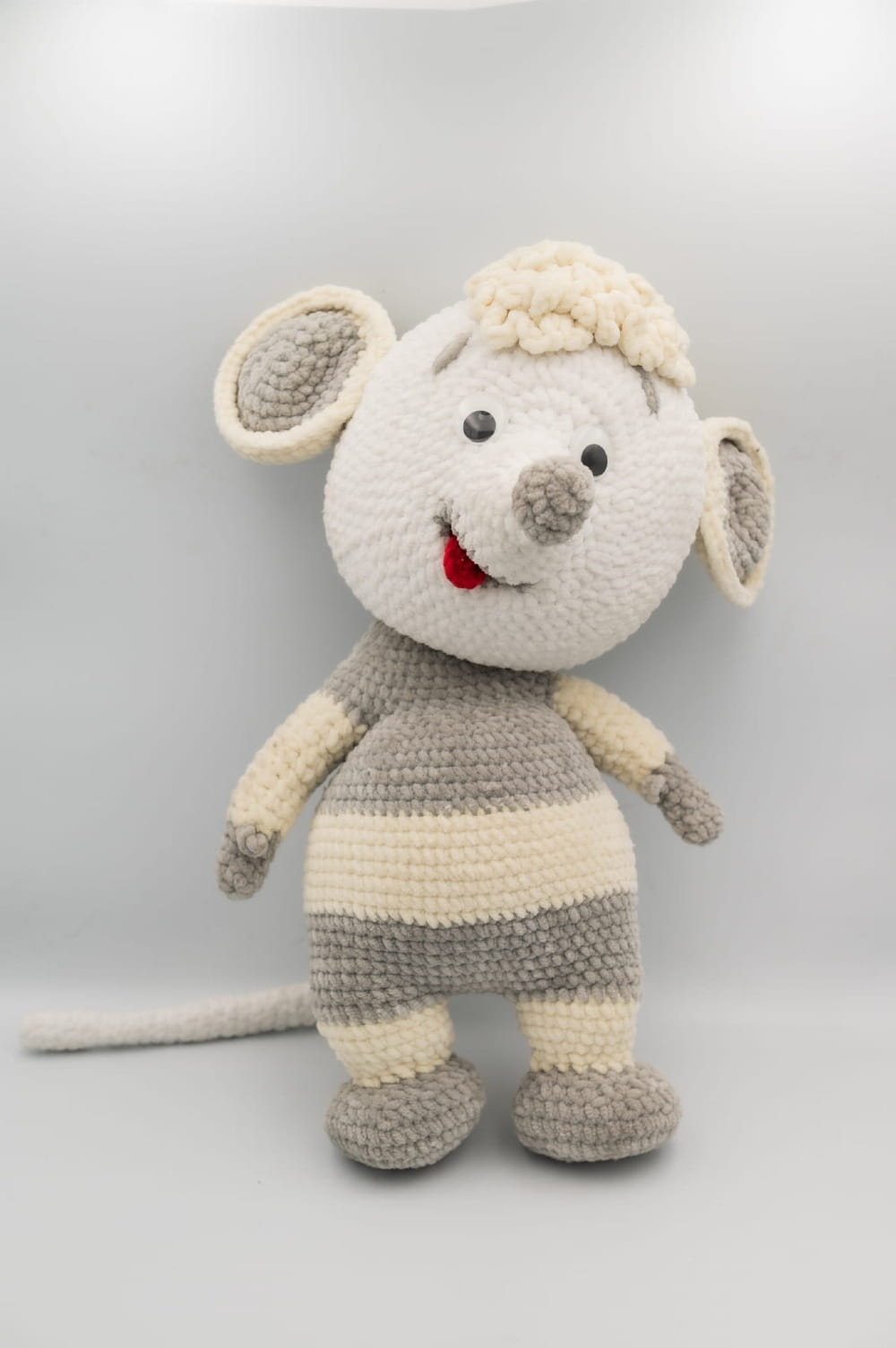 Ta duża mysz została ręcznie wykonana na szydełku z wysokiej jakości włóczki w odcieniach szary, biały i beżowy. Miękka, przytulna i starannie wykonana, stanowi urokliwą dekorację wnętrza – na półce, łóżku czy fotelu.