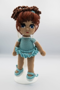 Dziewczynka w niebieskiej sukience, wykonana ręcznie z włóczki na szydełku. Piękna dekoracja, która wprowadza urok i kolor do wnętrza.