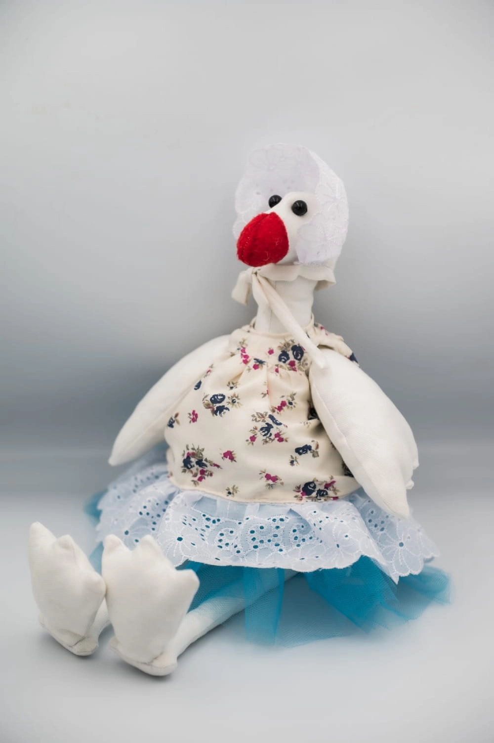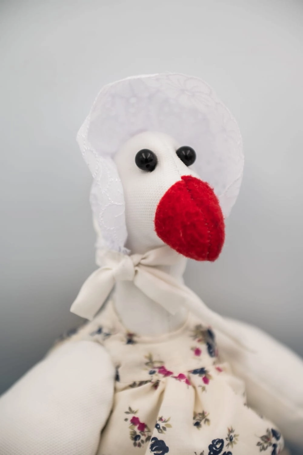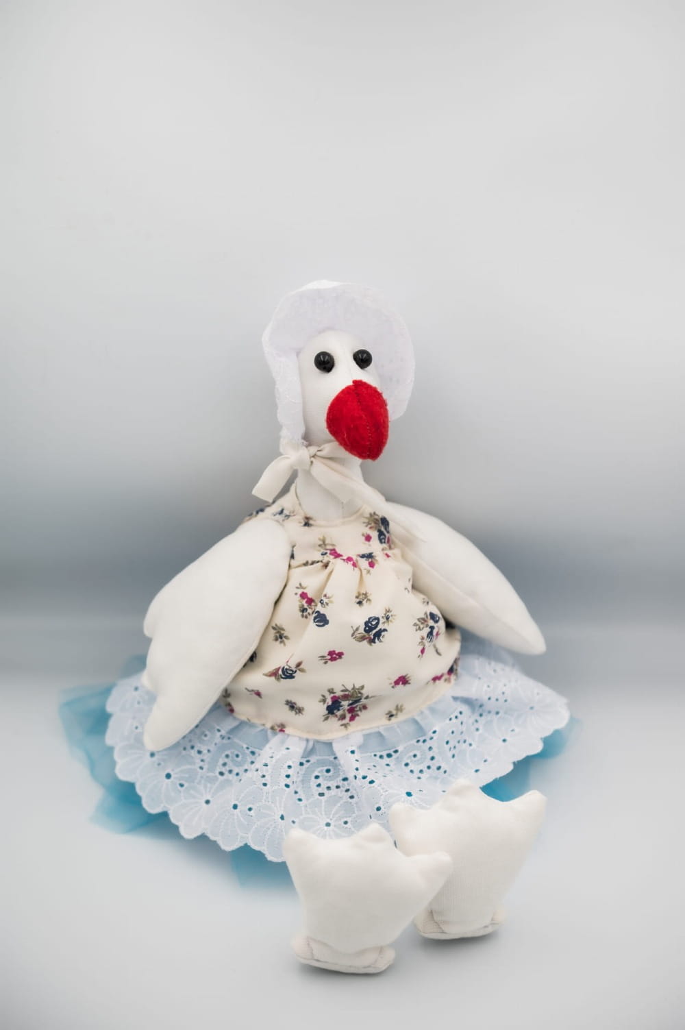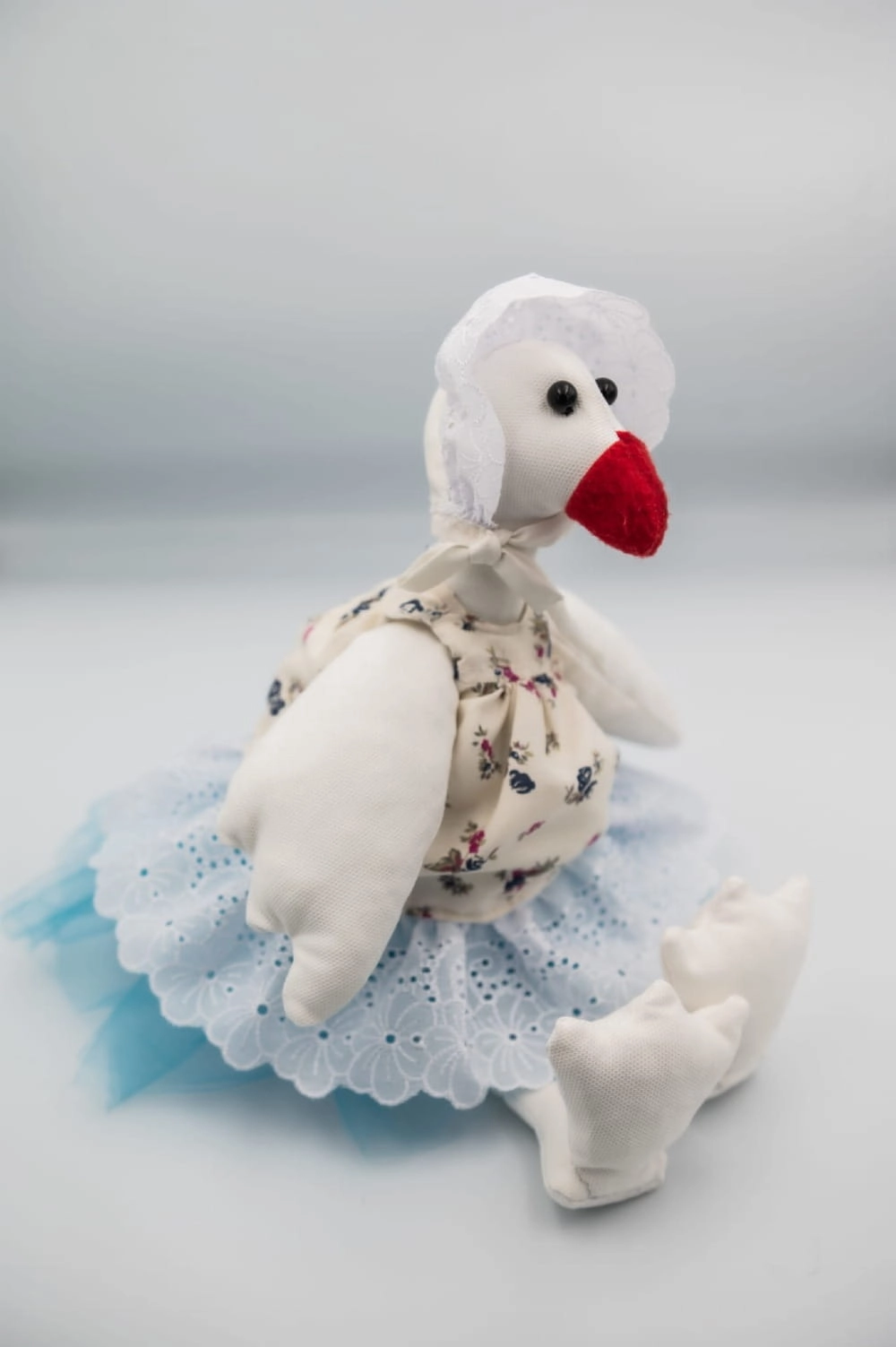 Model wyróżnia się dopracowanymi detalami – od miękko modelowanej sylwetki, przez wyrazisty, czerwony dzióbek, aż po starannie dobraną stylizację. Gąska ubrana jest w jasną sukienkę z kwiatowym wzorem, wykończoną warstwą koronki oraz lekkiego, błękitnego tiulu, który nadaje całości lekkości i elegancji. Na głowie znajduje się subtelna, biała chusteczka o delikatnej fakturze, podkreślająca sielski, klasyczny charakter kompozycji.