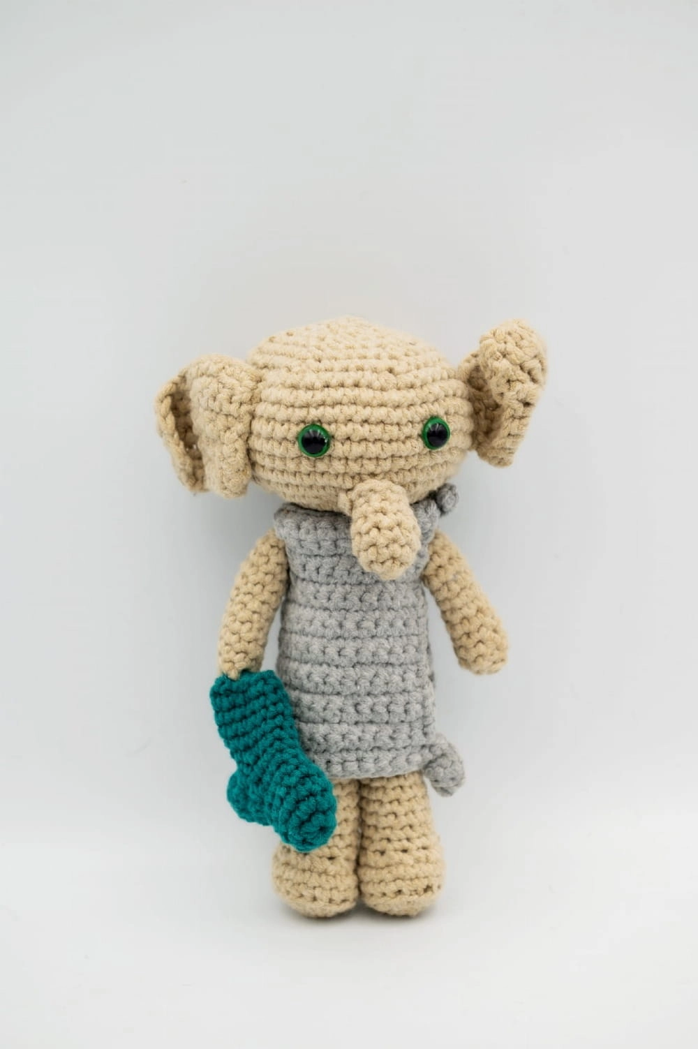 Figurka z zieloną skarpetą to ręcznie wykonana w Polsce postać z włóczki. Charakterystyczna skarpeta dodaje figurce humoru i wyrazistego akcentu kolorystycznego.