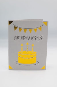 Elegancka kartka okolicznościowa z napisem Birthday Wishes, ilustracją tortu oraz złotą girlandą. Subtelne, dekoracyjne detale nadają jej odświętny charakter. W zestawie dopasowana koperta.