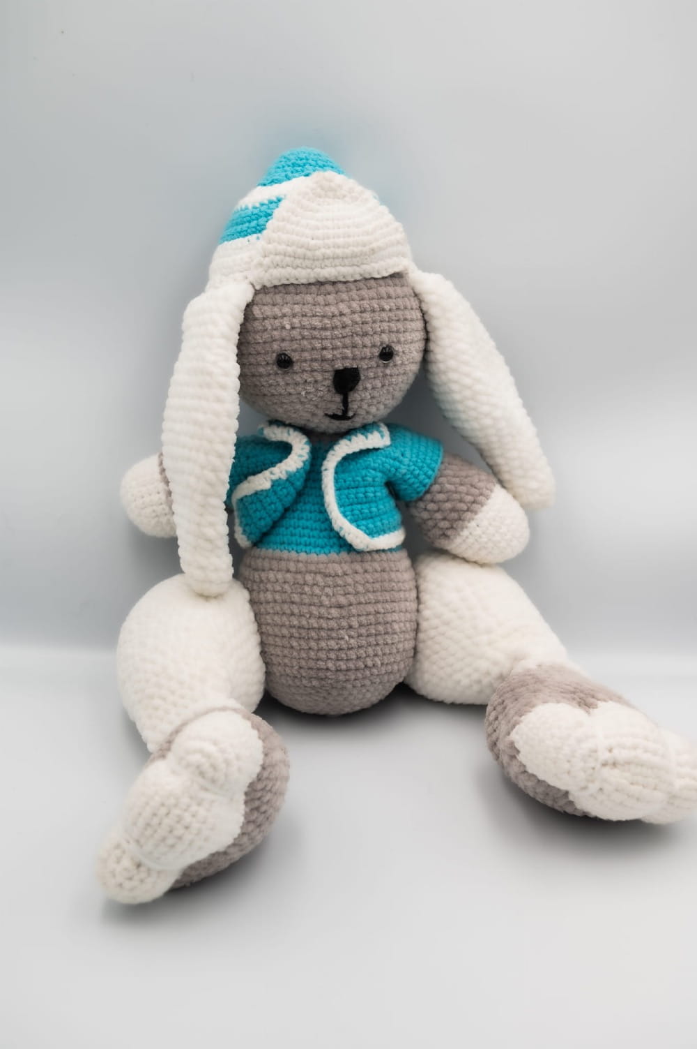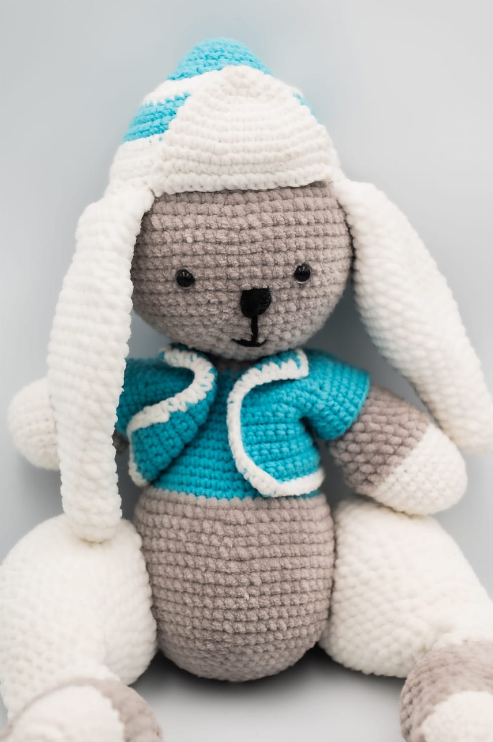 Królik w niebieskiej czapce, ręcznie zrobiony z włóczki na szydełku