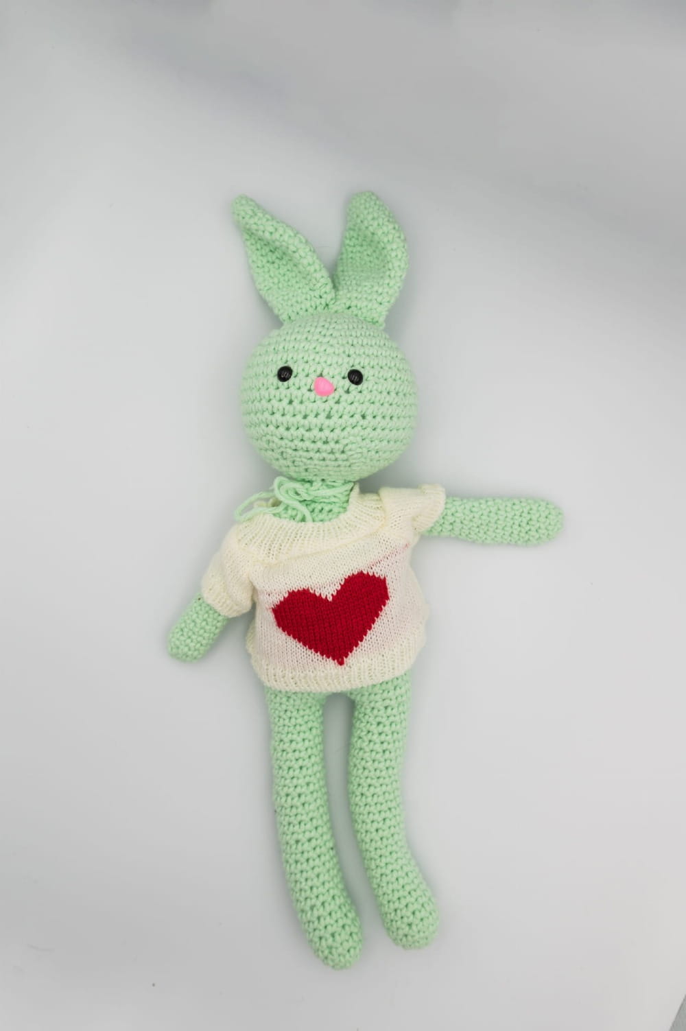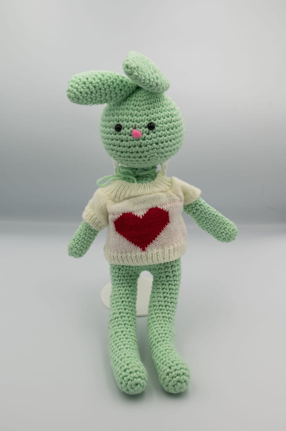 Ręcznie wykonany królik na szydełku w zielonym kolorze, ubrany w sweterek z czerwonym sercem – uroczy element dekoracyjny i oryginalny upominek. Ręcznie stworzony w Polsce.
