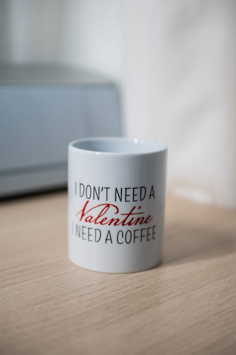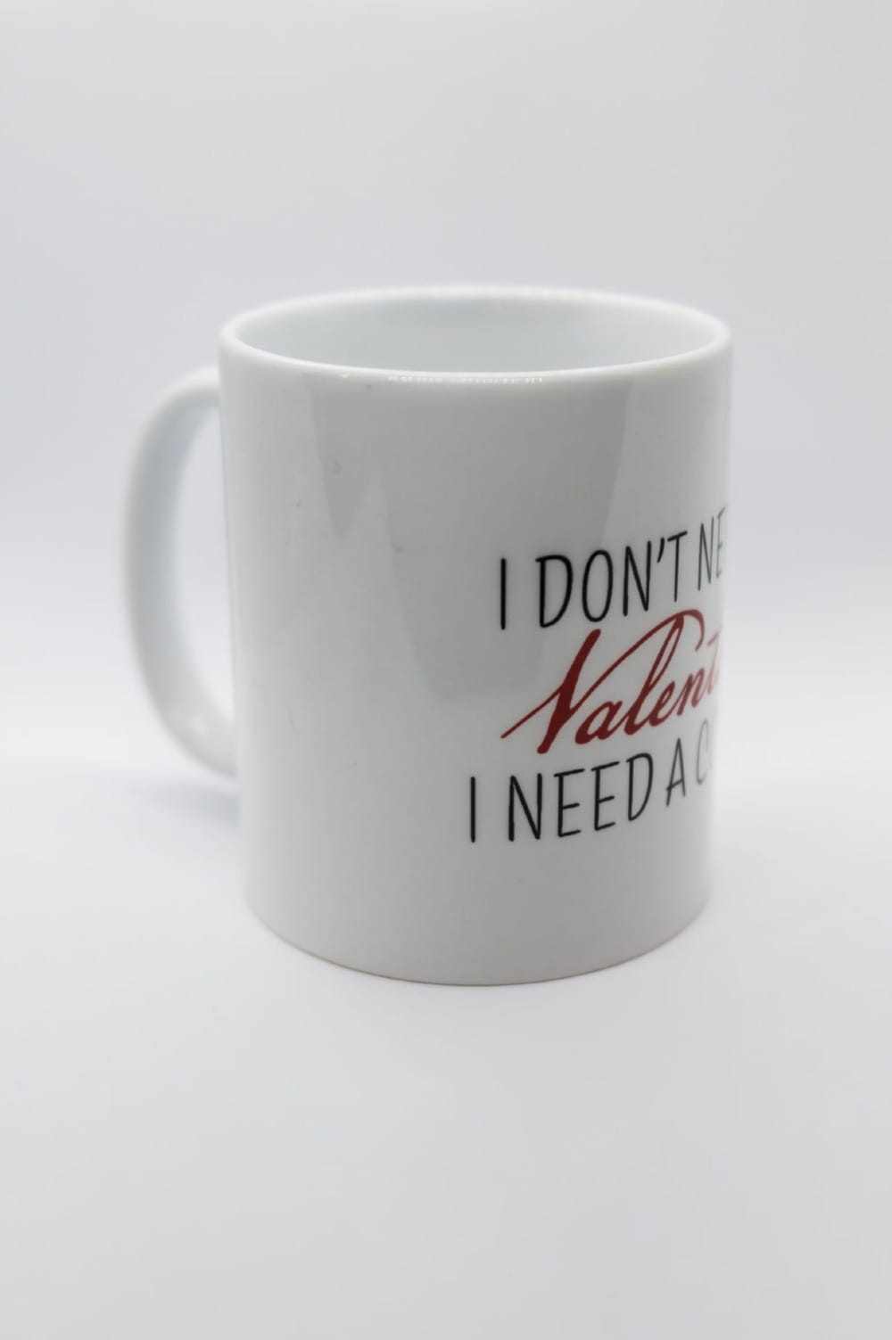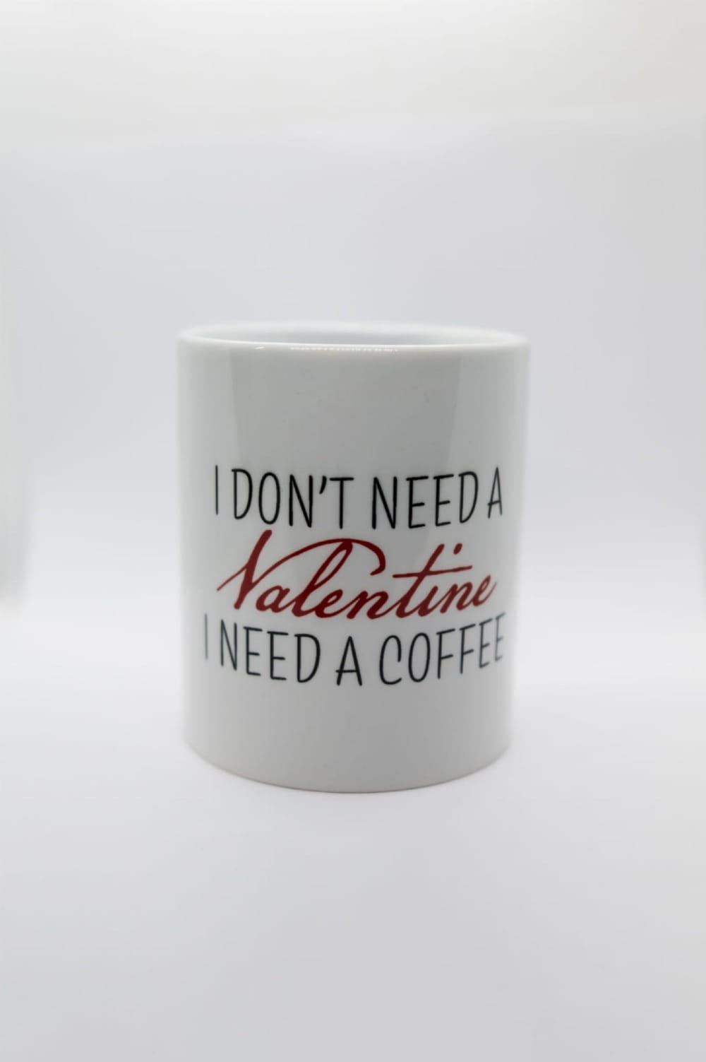 Zabawny kubek dla miłośników kawy z napisem „I don’t need a Valentine, I need a coffee”.