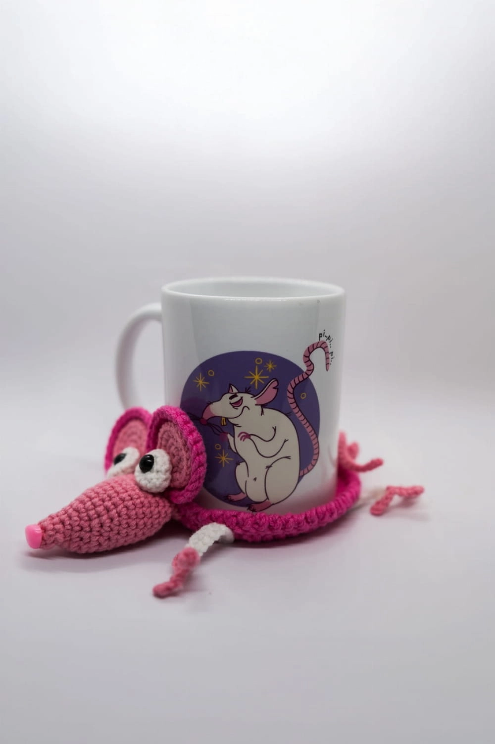 Oryginalny zestaw składający się z kubka z nadrukiem uroczego szczurka oraz dopasowanej podkładki wykonanej ręcznie na szydełku z włóczki. Na kubku znajduje się ilustracja szczura w stylu kreskówkowym, a po drugiej stronie umieszczono prosty, humorystyczny napis „pij”, który nadaje całości lekki i zabawny charakter.