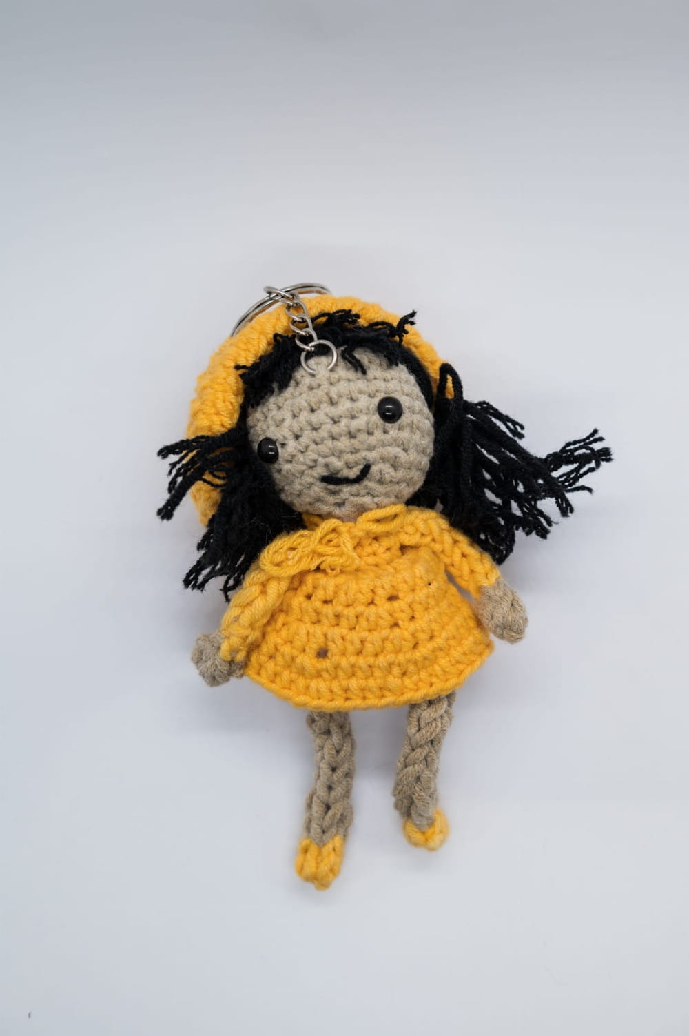 Ręcznie robiony brelok w kształcie lalki w żółtym ubranku, wykonany na szydełku z miękkiej włóczki. Uroczy, kolorowy i lekki dodatek do kluczy, plecaka lub torby. Idealny prezent handmade dla dzieci i dorosłych.