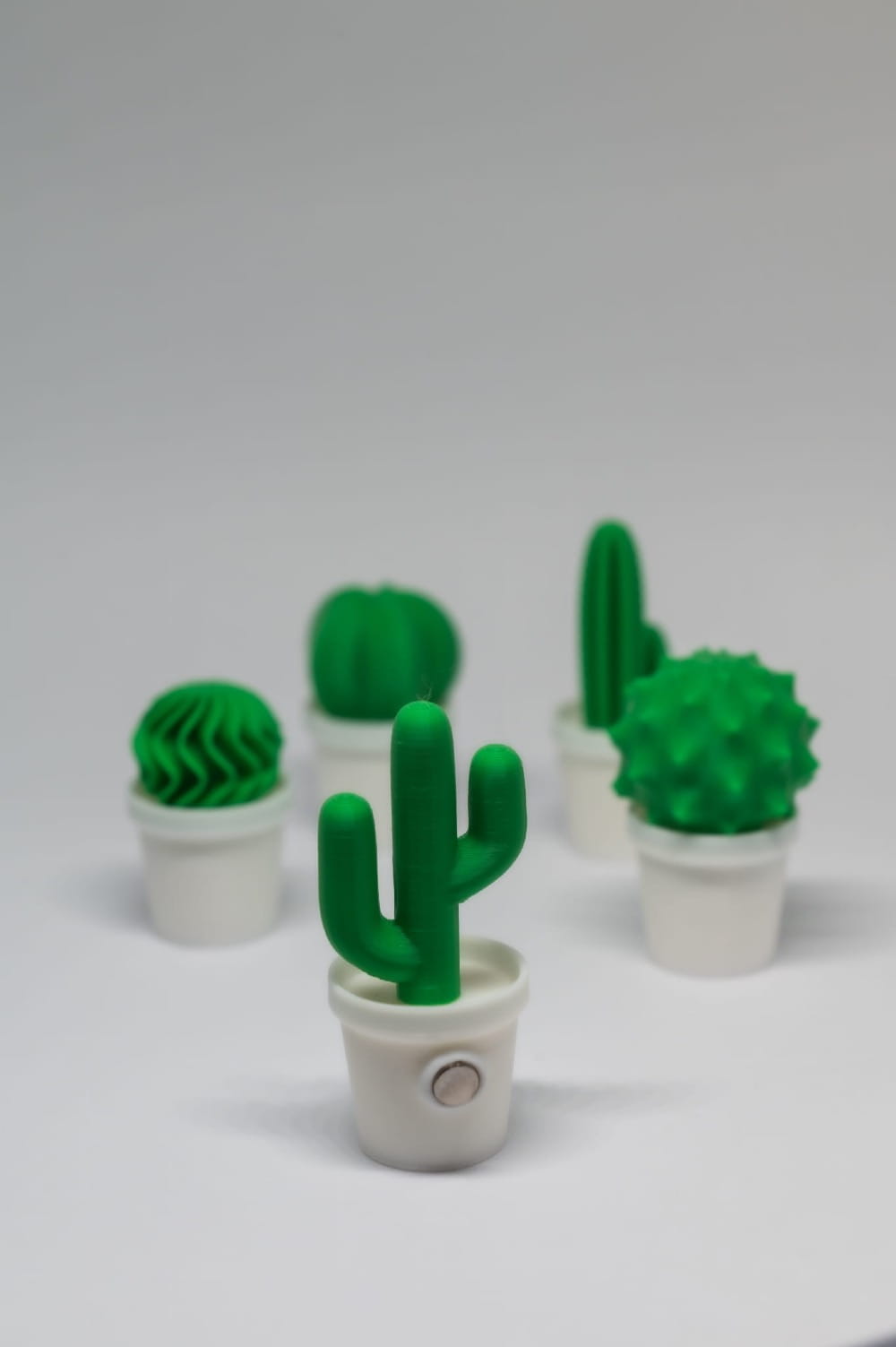 Zestaw małych magnesów w kształcie kaktusów w białych doniczkach. Dekoracyjny i praktyczny dodatek, który doda uroku każdej lodówce lub tablicy magnetycznej.