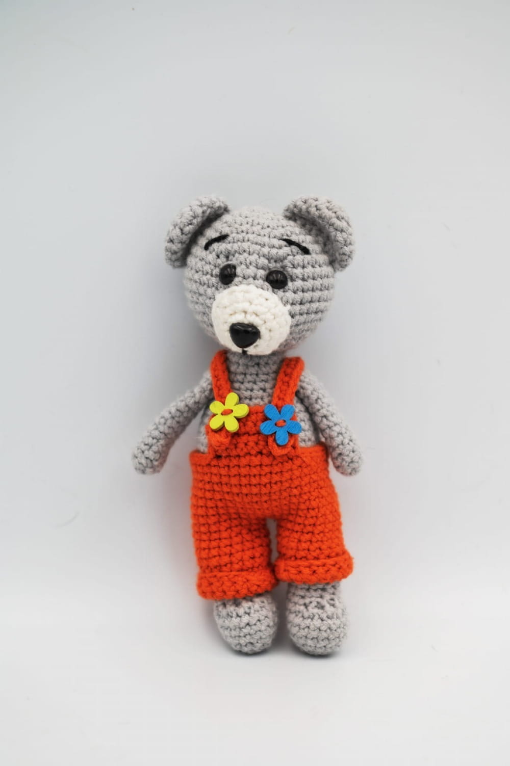 Miś w pomarańczowych ogrodniczkach to ręcznie wykonana w Polsce postać z włóczki. Wyrazisty kolor ubranka i starannie dopracowane detale nadają mu ciepły i przyjazny charakter.