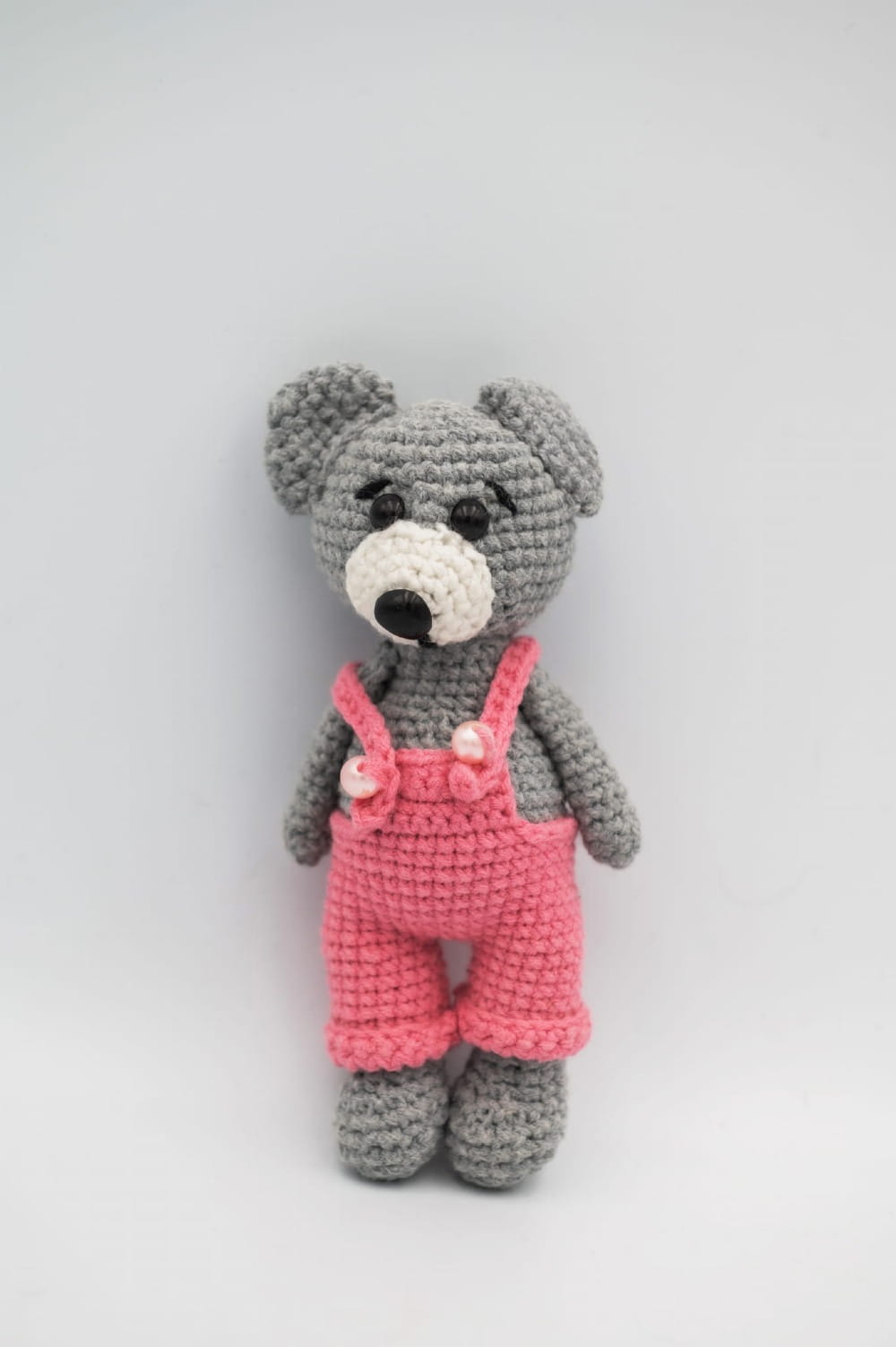Miś w różowych ogrodniczkach to autorska dekoracja ręcznie wykonana w Polsce z włóczki. Charakterystyczne różowe ogrodniczki dodają mu subtelnego, wiosennego akcentu kolorystycznego i sprawiają, że postać przyciąga wzrok swoją radosną formą.