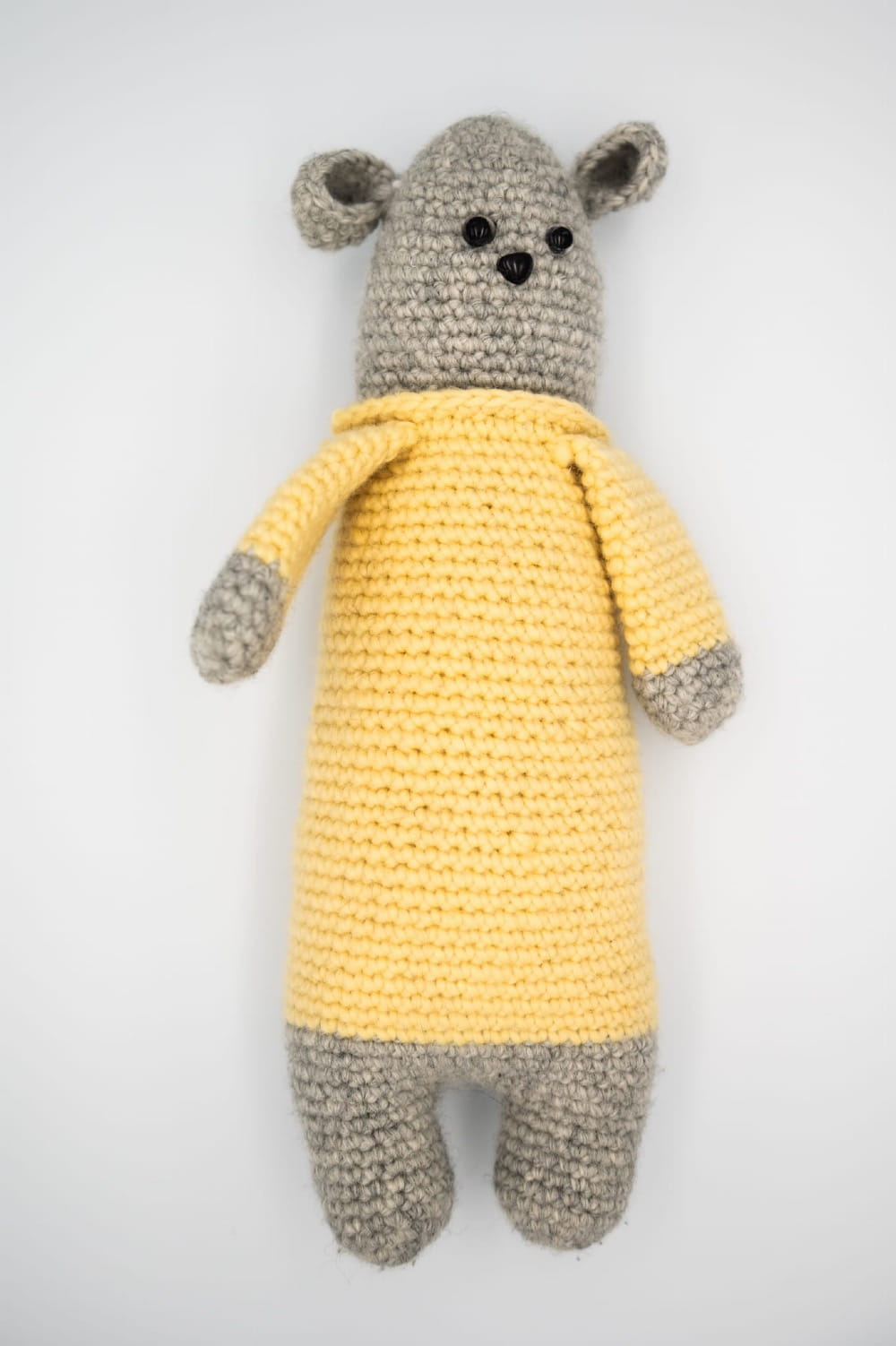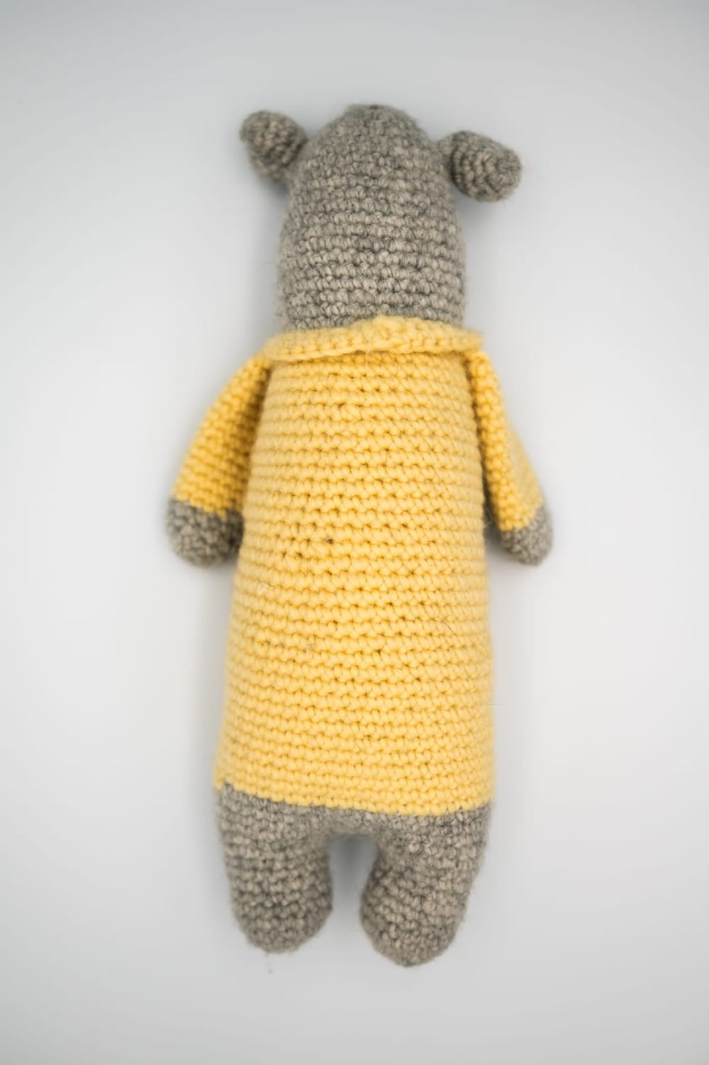 Ręcznie wykonana postać niedźwiedzia w pastelowej kolorystyce, idealna do wszelkiego rodzaju stylizacji wnętrz. Jej wyjątkowy wygląd, z szarym ciałem i żółtym ubraniem, sprawia, że doskonale wpasuje się w nowoczesne, ale także przytulne przestrzenie. Produkt stanowi doskonały wybór jako osobisty prezent na specjalne okazje.