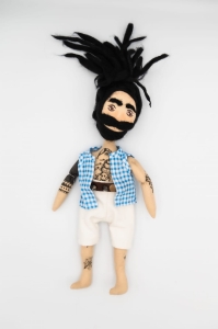 Czarne dredy i broda, biała kamizelka w niebieską kratkę i tatuaże – ręcznie szyty, wyrazisty bohater z charakterem, który przyciąga wzrok.