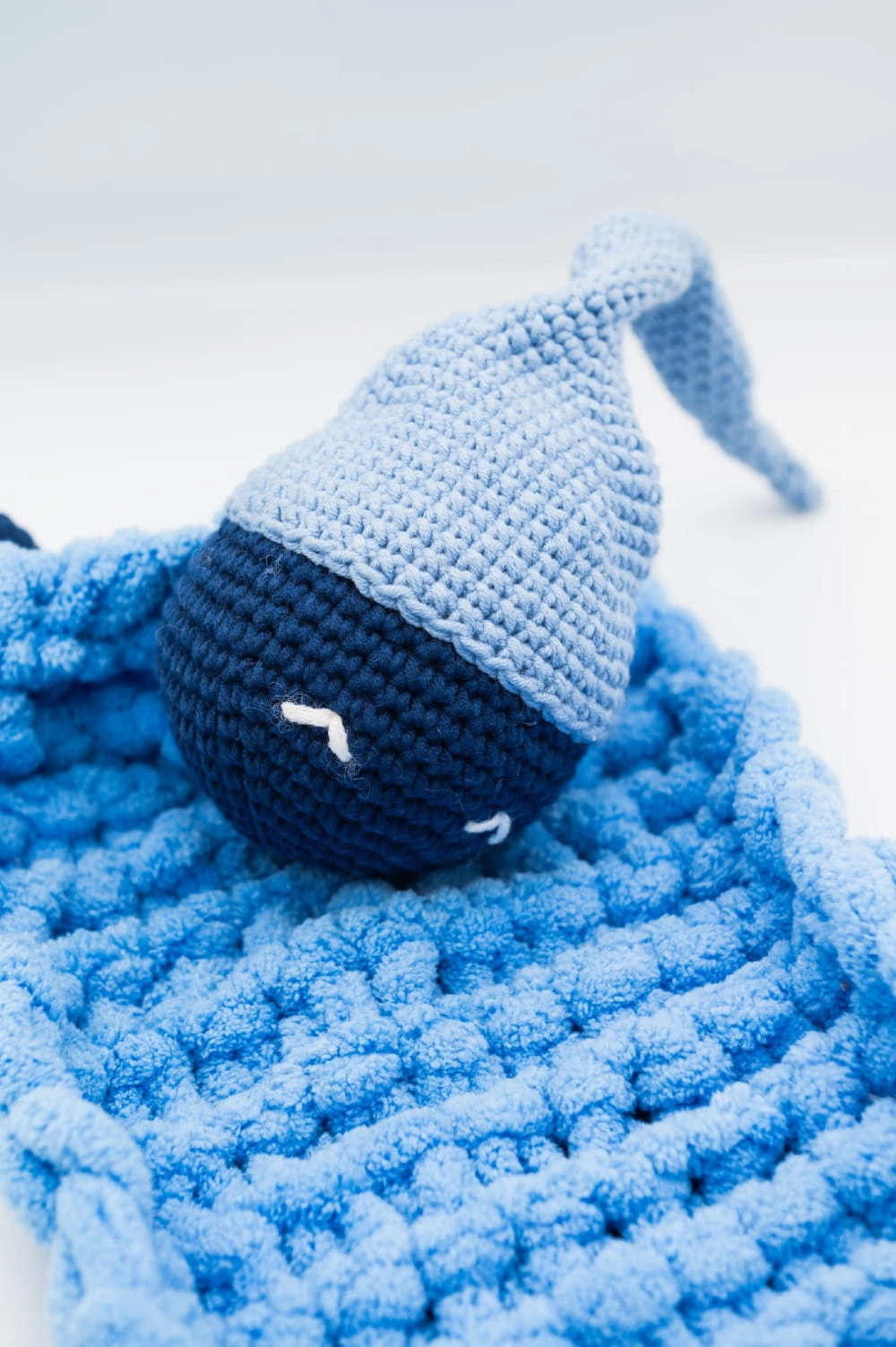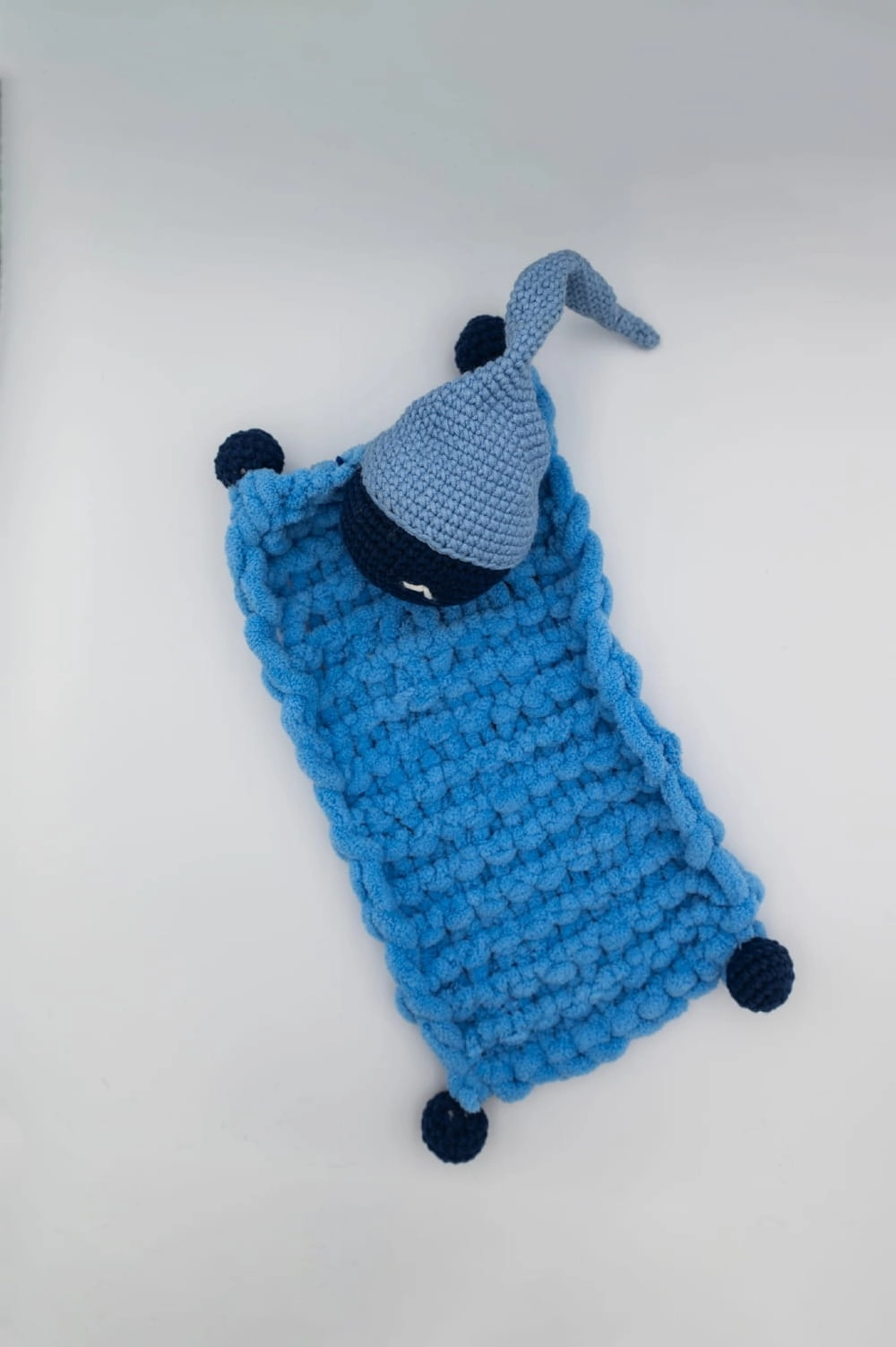Nightcap to niebieski, dekoracyjny kocyk wykonany ręcznie z miękkiej włóczki, ozdobiony granatową głową krasnala w niebieskiej czapce do spania. Wyjątkowy akcent do aranżacji wnętrza. Ręcznie stworzony w Polsce.
