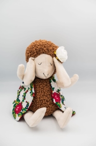 Jej kręcone, karmelowe futerko harmonizuje z jasnym kolorem twarzy i łapek, a kwiatowa pelerynka nawiązuje do folklorystycznych motywów, dodając dekoracji wyjątkowego charakteru. Umieszczony przy uchu delikatny kwiat podkreśla subtelność projektu.