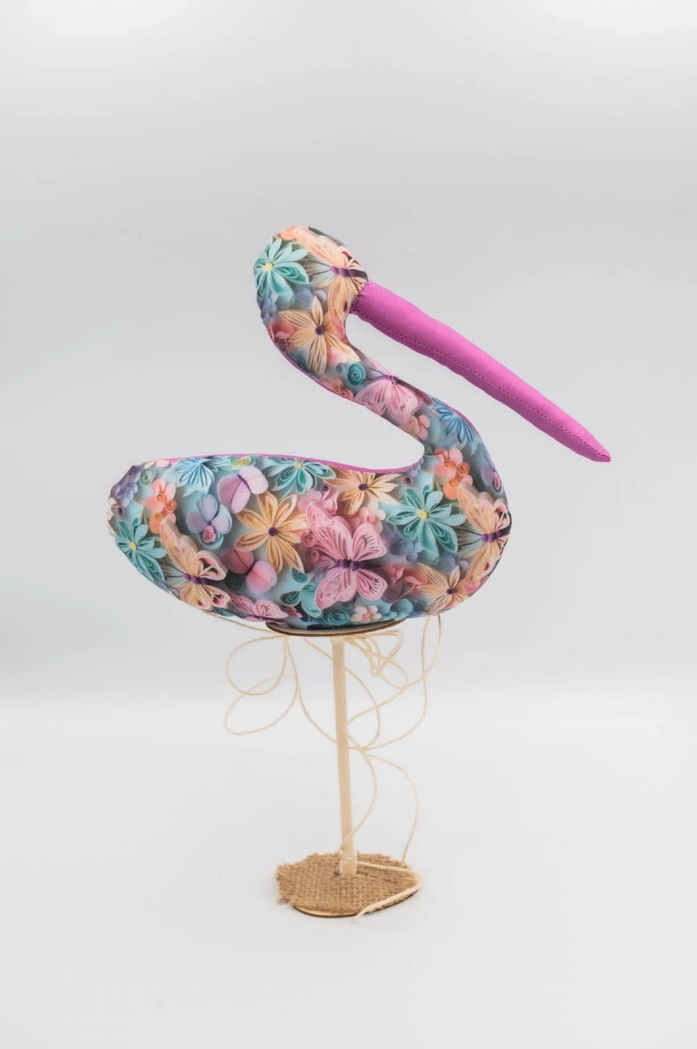 Autorski pelikan dekoracyjny wykonany ręcznie z dbałością o detal i proporcje. Smukła, lekko wygięta forma nadaje mu elegancki, współczesny charakter, a bogaty, kwiatowy wzór w pastelowych i turkusowych tonach tworzy efekt głębi i lekkości. Kontrastujący, intensywnie różowy tył podkreśla nowoczesny styl projektu i sprawia, że forma prezentuje się efektownie z każdej strony.