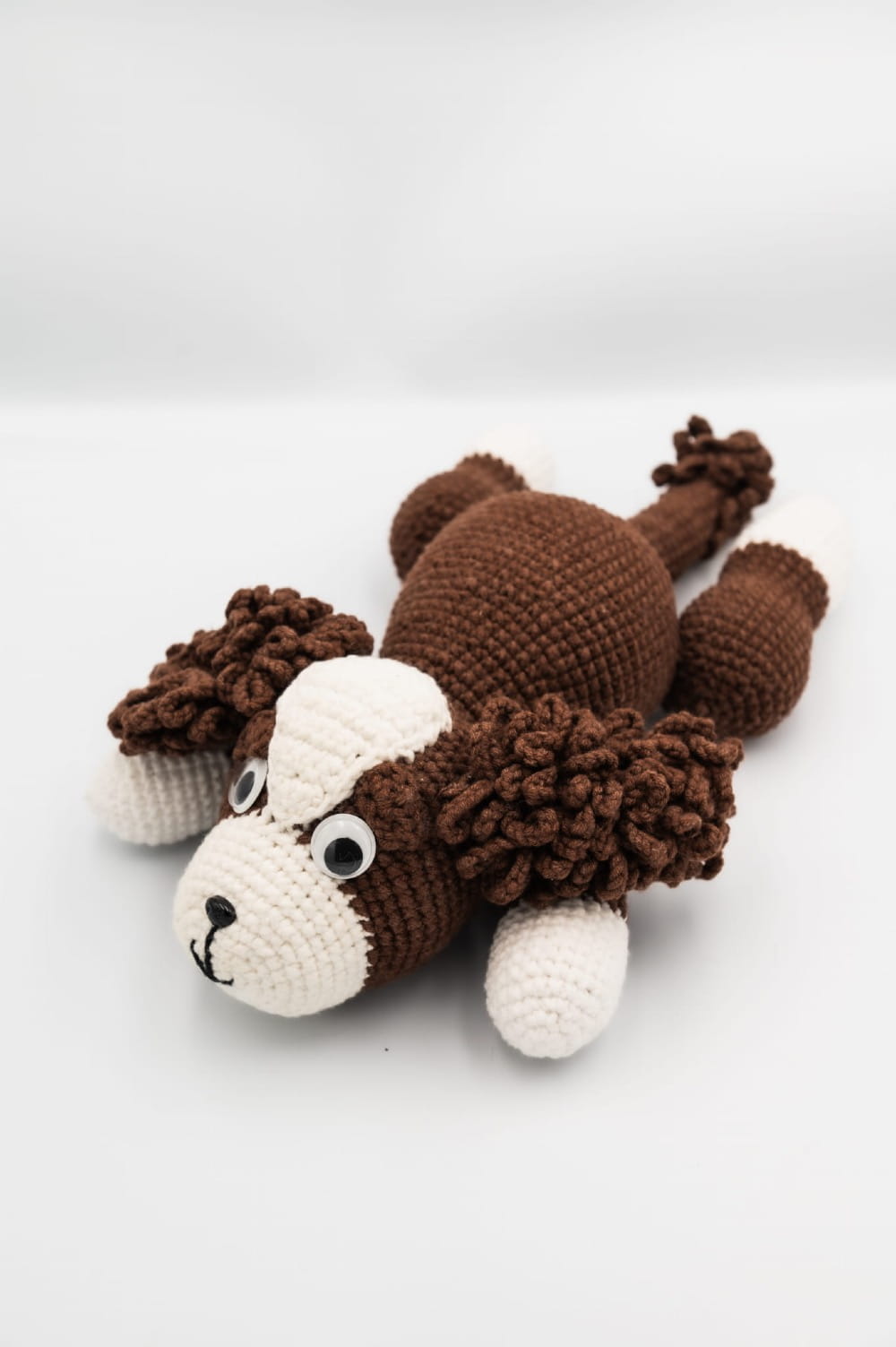 Pies brązowo-biały, ręcznie zrobiony z włóczki na szydełku