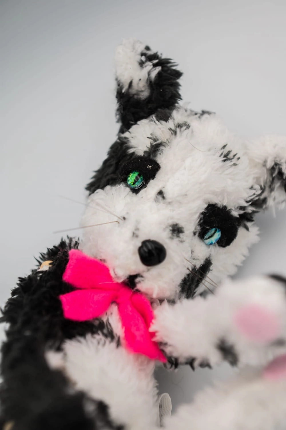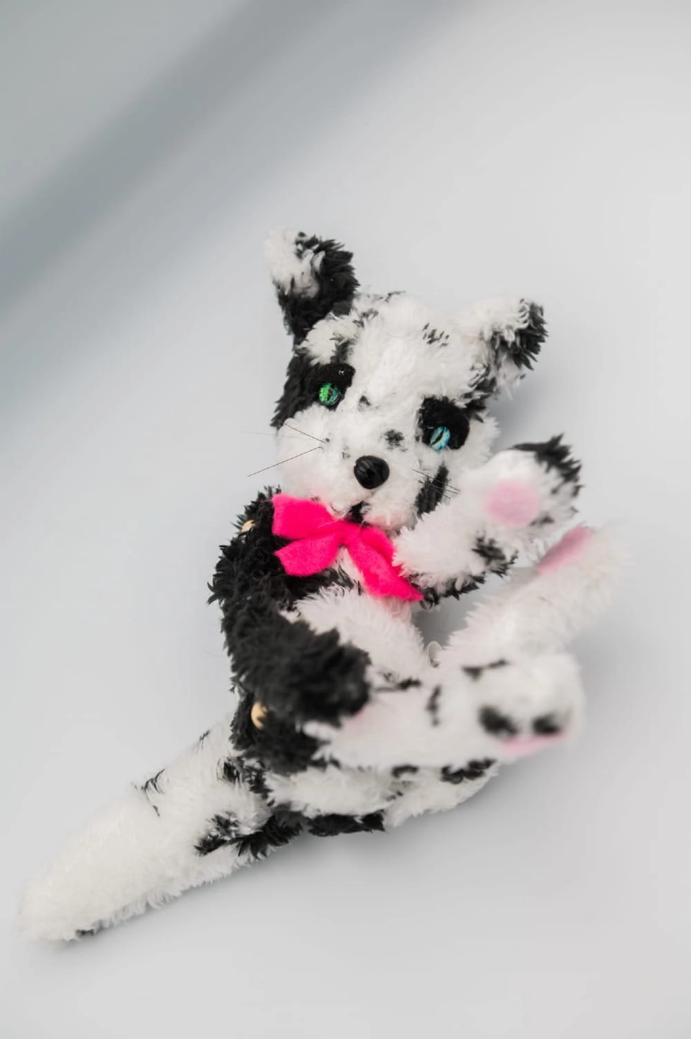 Urocza figurka kota wykonana z miękkiego i przyjemnego w dotyku materiału, wyróżniająca się kontrastowym czarno białym umaszczeniem oraz wyrazistymi oczami. Całość dopełnia kolorowa kokardka, która nadaje jej charakterystyczny i przyciągający uwagę wygląd.