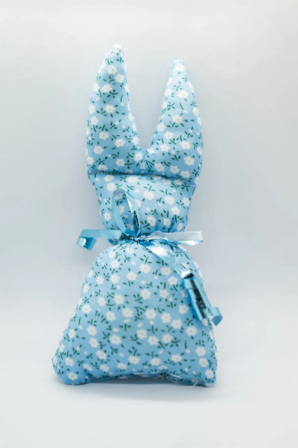 Ręcznie szyty zając w delikatnym, niebieskim materiale w drobne białe kwiatki, ozdobiony kokardą. Subtelna, dekoracyjna forma w wiosennym klimacie.