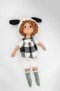 Starannie wykonana postać dekoracyjna z kręconymi włosami i uroczym strojem w czarno-białą kratę. W zestawie dodatkowe elementy garderoby: spodnie z haftem serc i motylem, koszulka z długim rękawem oraz brązowy płaszczyk, które pozwalają tworzyć różne stylizacje. Idealna jako wyjątkowy akcent do wnętrz w stylu vintage, rustykalnym lub skandynawskim.