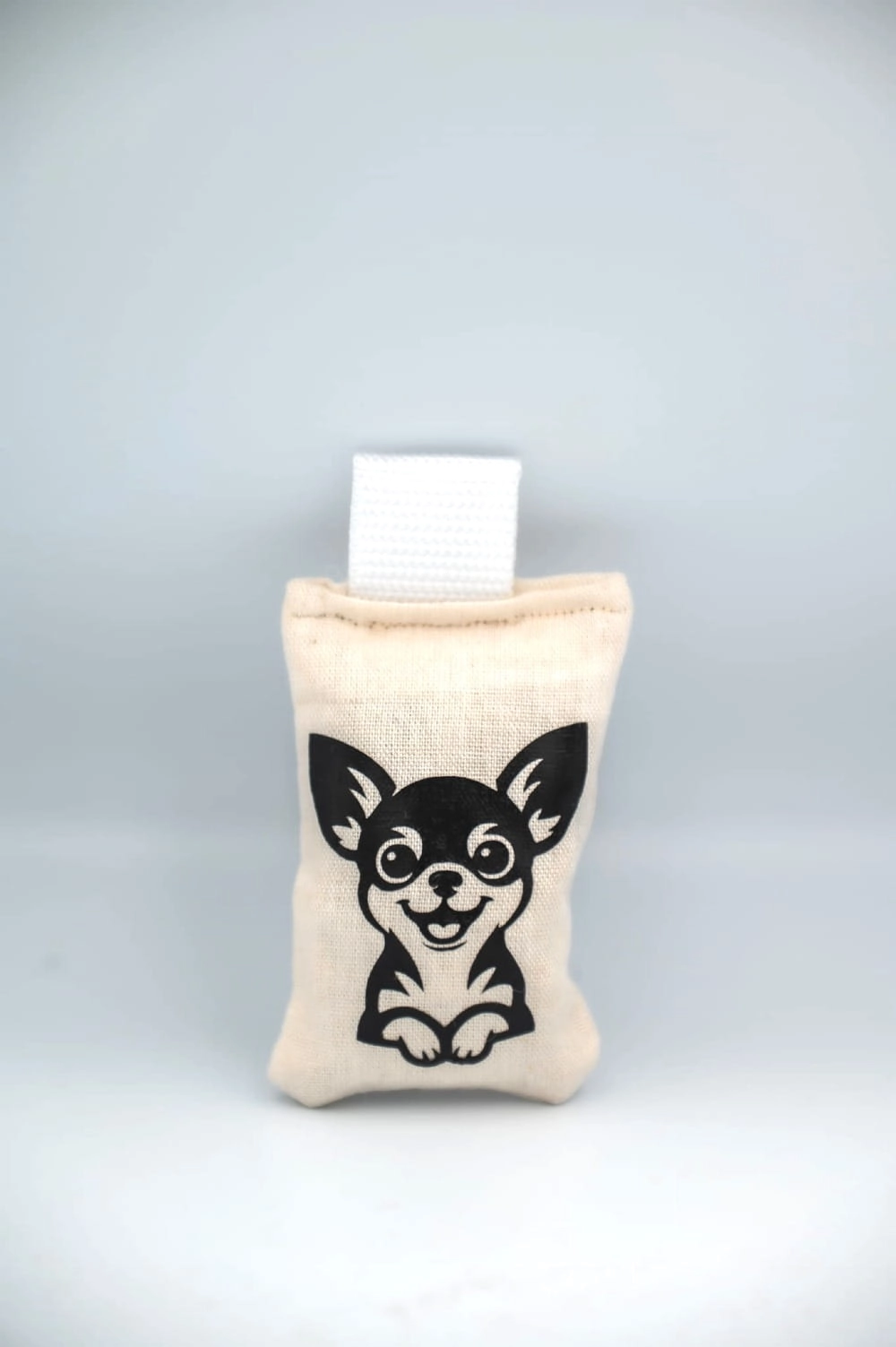 Uroczy brelok z nadrukowanym motywem Chihuahua. Lekki, bawełniany i starannie wykonany – idealny jako stylowy dodatek do kluczy, plecaka lub torebki.