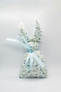 Ten ręcznie szyty zając zachwyca delikatnym, kwiatowym wzorem w odcieniach niebieskiego i żółtego na białym tle.