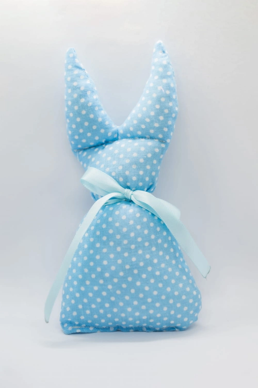 Ten ręcznie szyty zając przyciąga wzrok swoim delikatnym wzorem – błękitne tło zdobią subtelne białe kropki.