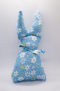 Ręcznie szyty zając z kokardą – niebieski w białe i żółte kwiatki