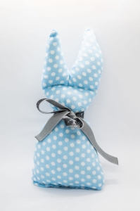 Ten ręcznie szyty zając wyróżnia się delikatnym, wesołym wzorem – niebieskie tło zdobią subtelne białe kropki.