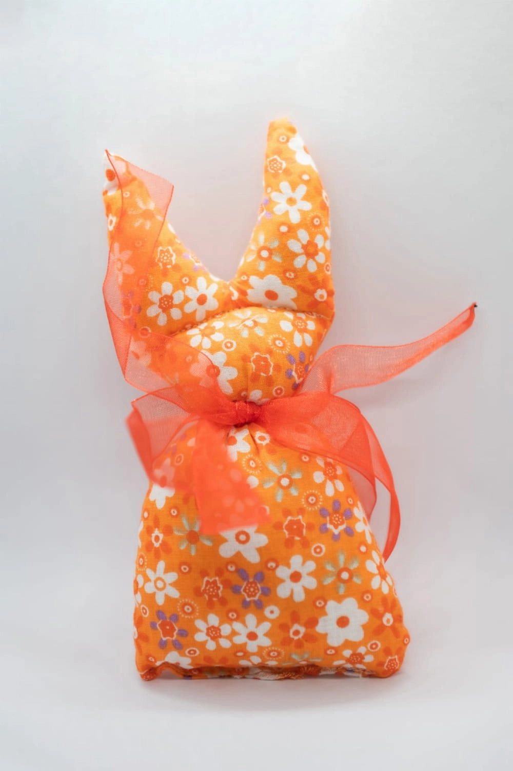 Ten ręcznie szyty zając wyróżnia się ciepłym, pomarańczowym kolorem z delikatnymi białymi i fioletowymi kwiatkami.