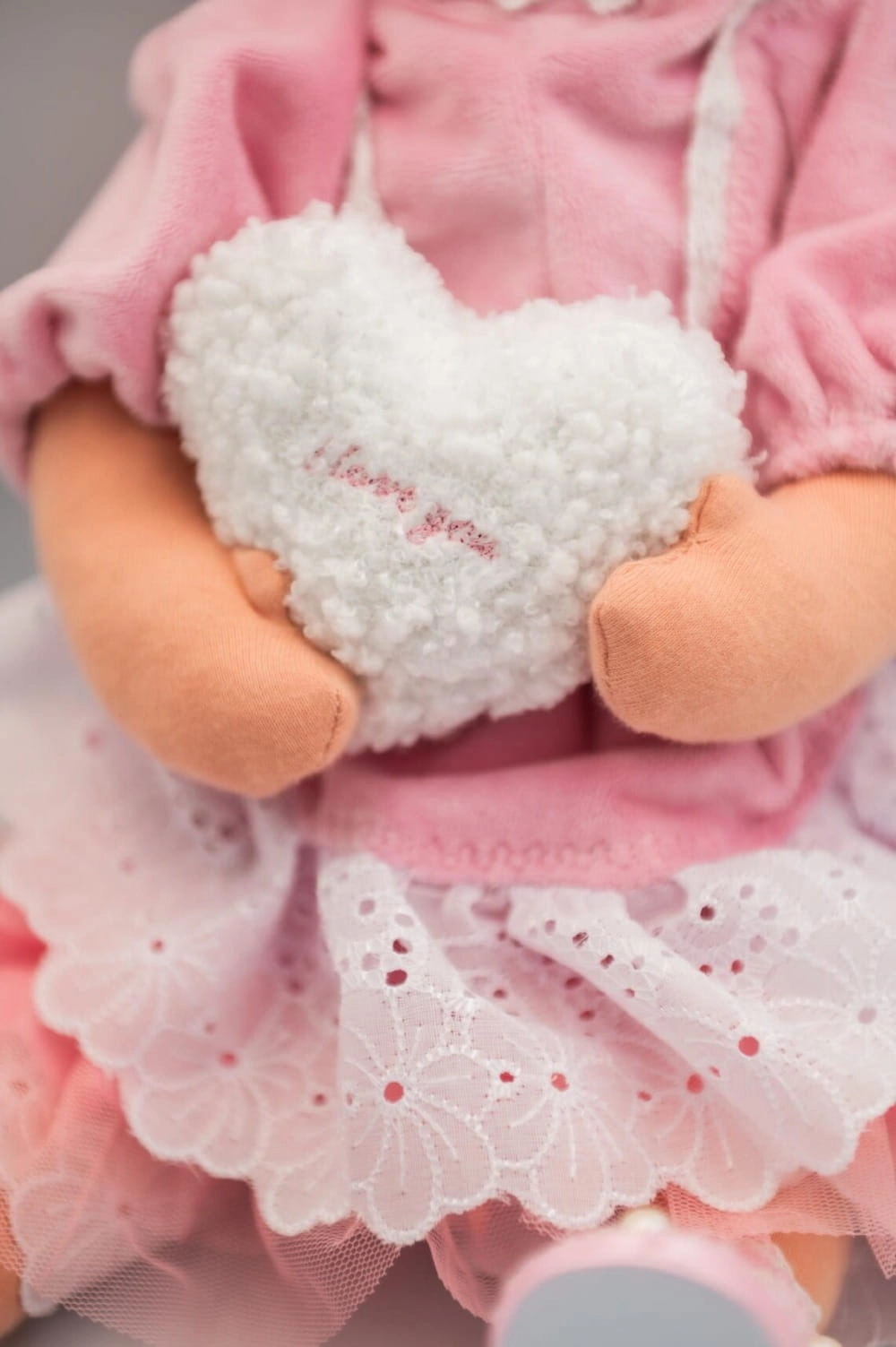 Wyjątkowa, ręcznie szyta figurka dekoracyjna, która wniesie urok i ciepło do każdego wnętrza. Figurkę charakteryzują delikatne, różowe warkocze i elegancka, różowa sukienka. W dłoniach trzyma urocze białe serduszko z napisem „I love you”, co czyni ją pięknym symbolem miłości i przyjaźni.