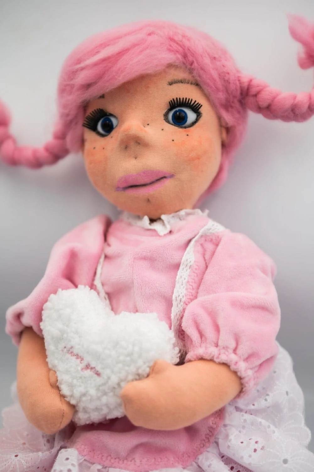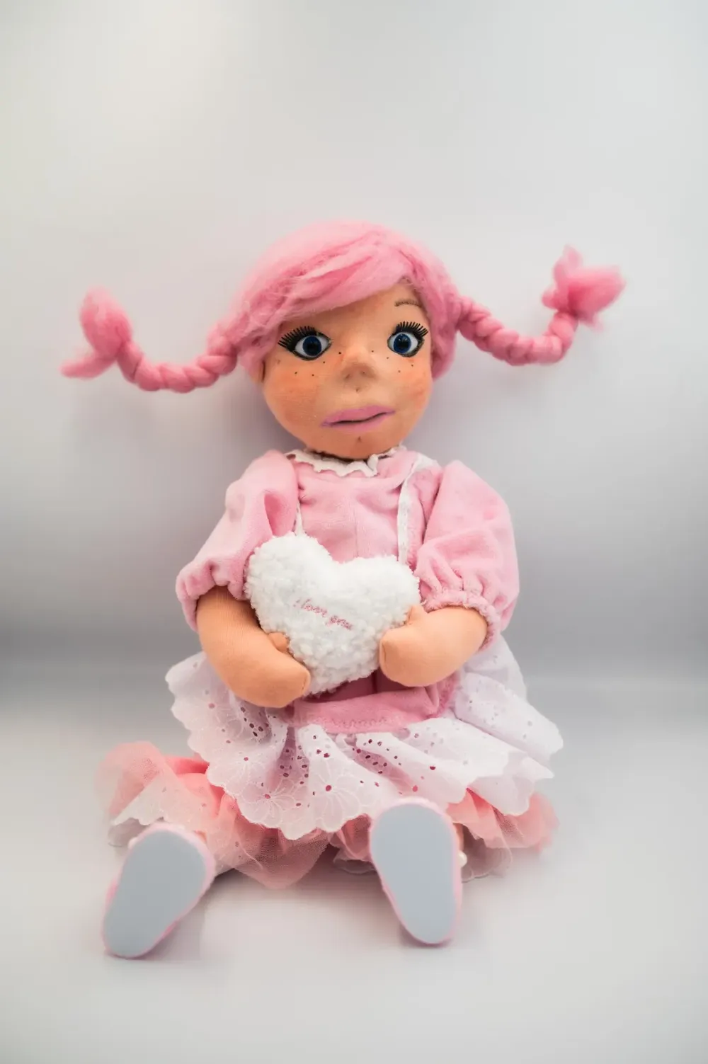 Ręcznie szyta figurka dekoracyjna z różowymi warkoczami i sukienką, trzymająca białe serduszko „I love you”. Idealna jako dekoracja lub prezent.