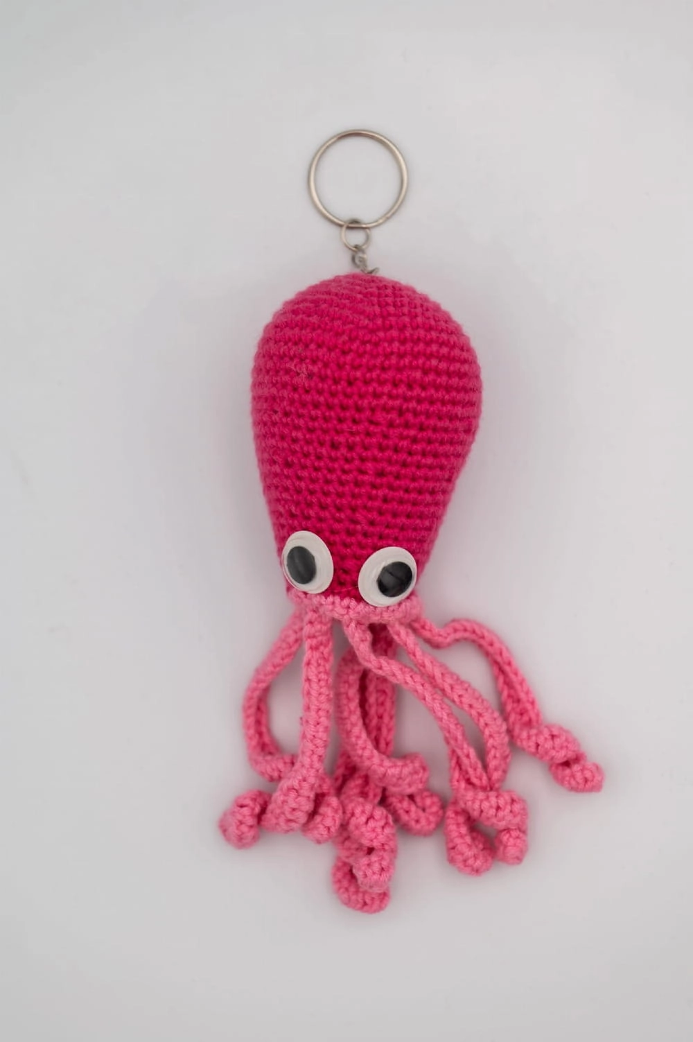 Różowa Ośmiornica to ręcznie wykonany z włóczki na szydełku brelok/zawieszka, który przyciąga uwagę intensywnym kolorem i dopracowanymi detalami. Każdy element został starannie uformowany, dzięki czemu całość prezentuje się estetycznie i wyjątkowo.