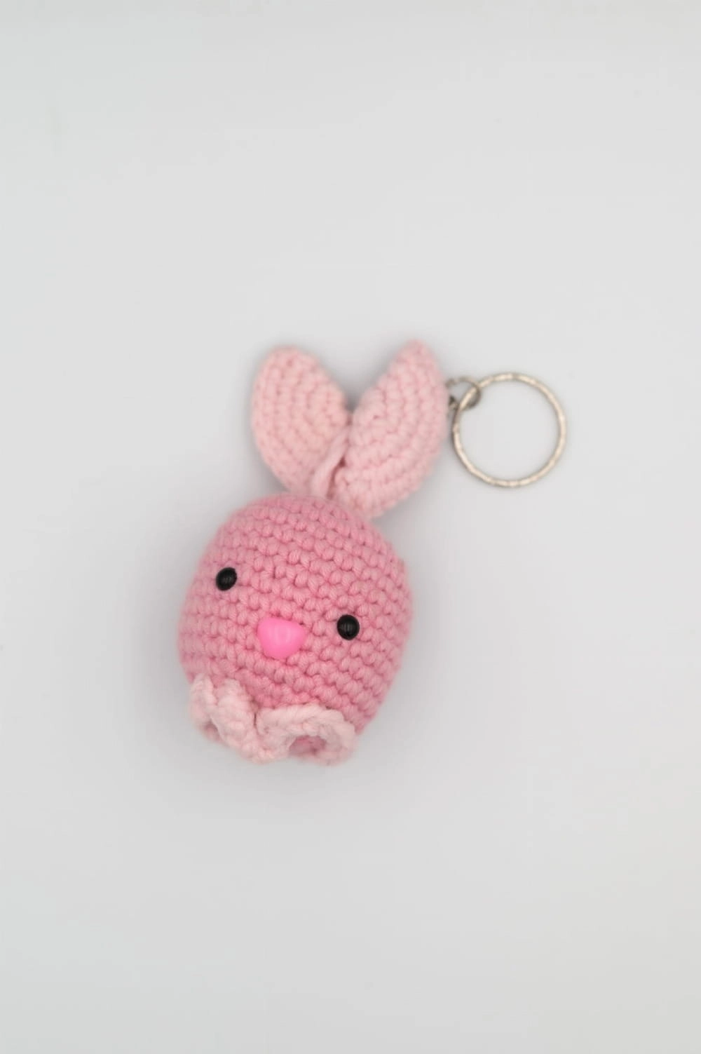 Ręcznie wykonany w Polsce brelok – różowa głowa królika, stworzona na szydełku z miękkiej włóczki. Uroczy dodatek do kluczy, torby lub plecaka.