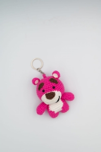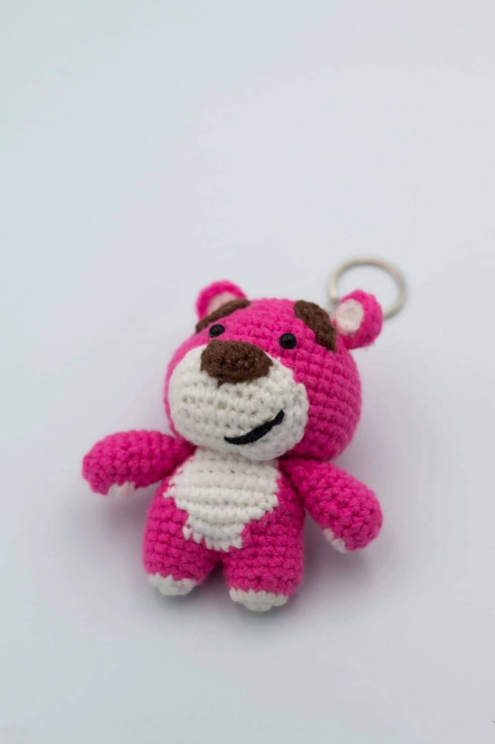 Ręcznie wykonany w Polsce brelok – różowo-biały miś, wykonany na szydełku z włóczki. Estetyczny dodatek do kluczy, torby lub plecaka.
